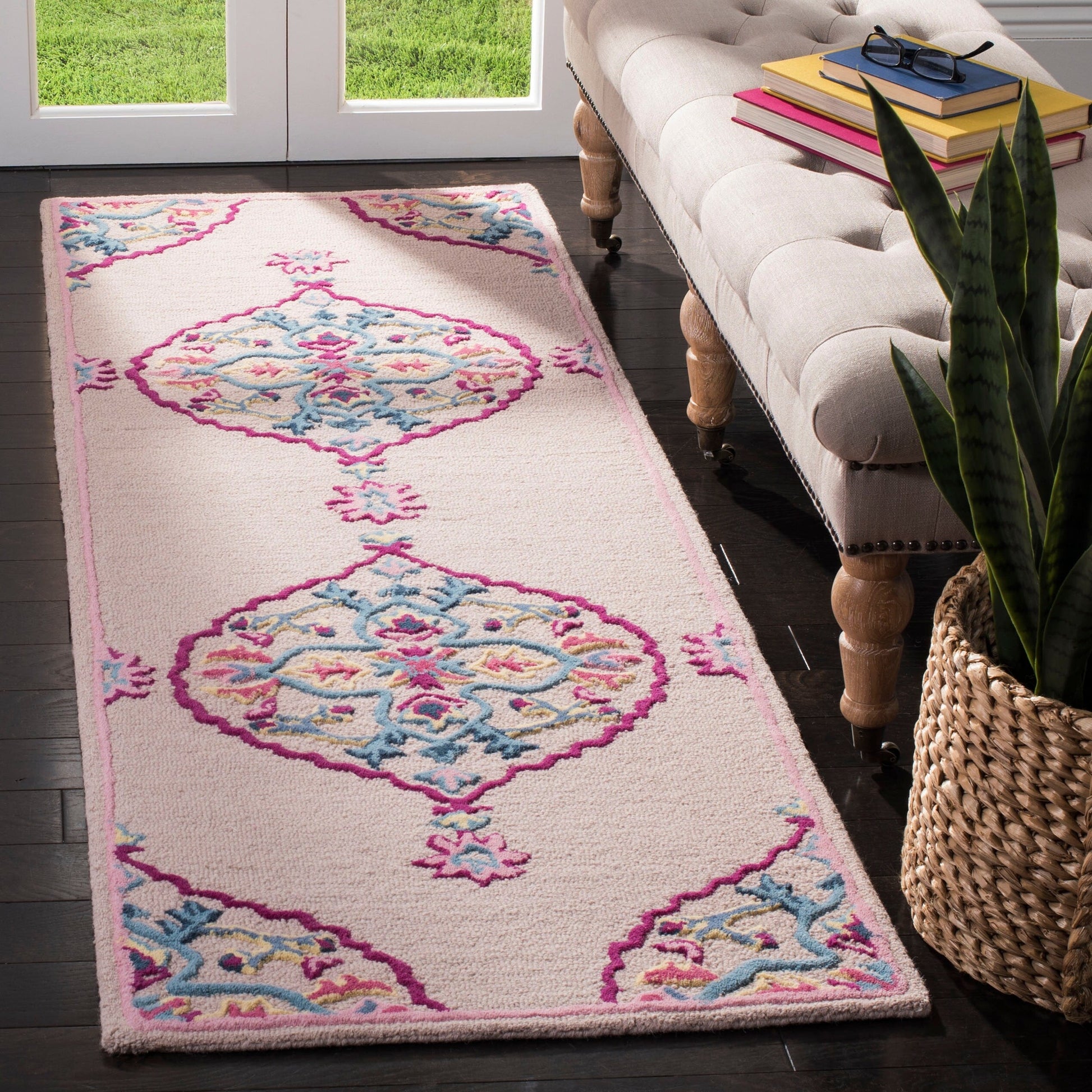 Découvrez notre somptueux tapis d'appoint en laine tuftée à la main, un ajout luxueux à tout espace en quête de couleur et d'élégance. Mesurant 60 x 90 cm, ce tapis, tissé avec une hauteur de velours de 1 cm, est idéal pour apporter chaleur et texture à votre intérieur. Confectionné avec soin et savoir-faire en Inde, ce tapis arbore une palette riche et vibrante de roses et de nuances multicolores, savamment entrelacées pour créer un motif captivant qui attire le regard et stimule l'imagination. Le motif complexe visible sur l'image révèle une symphonie de motifs floraux et ornementaux, évoquant les designs classiques revisités, et promet de s'harmoniser aussi bien avec un décor contemporain que traditionnel. La technique de tuftage à la main utilisée pour la création de ce tapis en laine garantit non seulement un toucher luxueux sous les pieds, mais aussi un niveau de détail exceptionnel et une grande durabilité. L'utilisation de la laine, matière naturellement douce et résistante, offre une surface moelleuse et confortable, à la fois facile d'entretien et suffisamment robuste pour les zones de passage fréquent. Que vous souhaitiez embellir votre salon, votre chambre ou votre entrée, notre tapis d'appoint en laine tuftée main rose et multicolore apporte une touche artisanale et raffinée à votre intérieur. Sa beauté intemporelle et sa qualité artisanale en font une pièce d'investissement précieuse qui sera chérie pendant de nombreuses années.