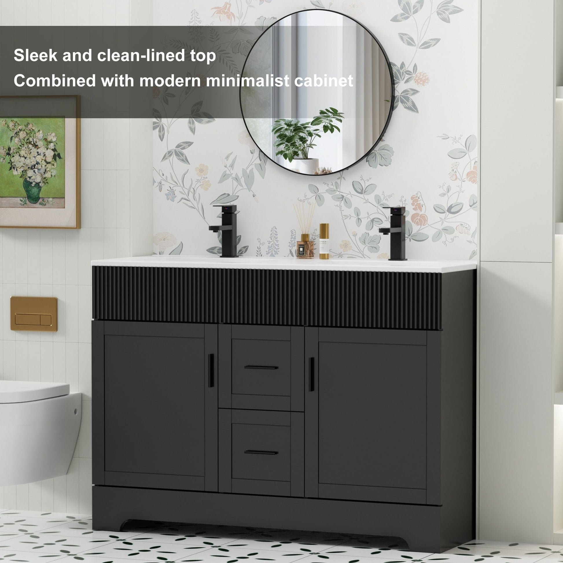 - Ensemble complet tout-en-un : meuble-lavabo, lavabo, robinet, bonde mécanique, conduites d'alimentation et quincaillerie. Aucune pièce supplémentaire requise !