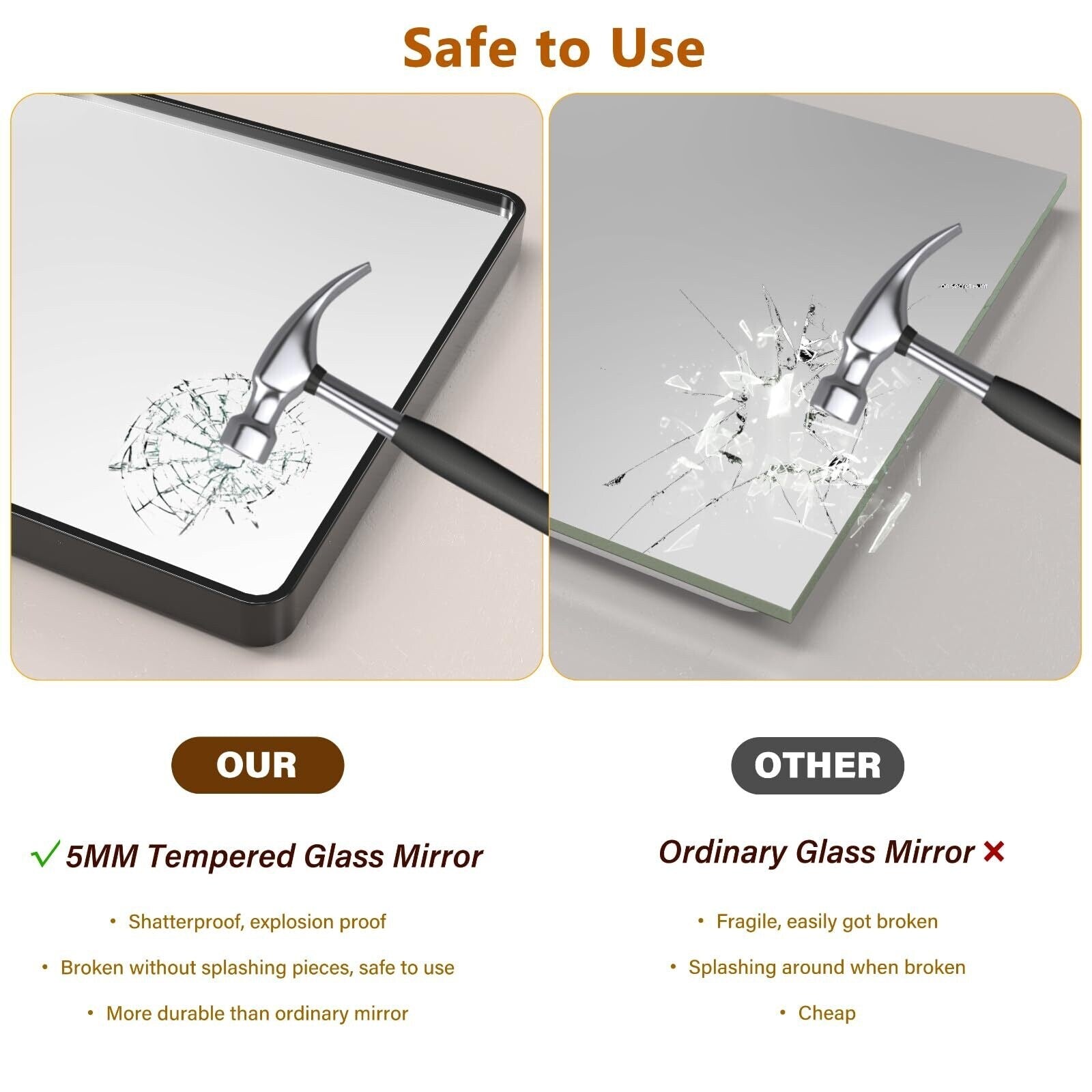【Superior Reflection Quality】Our 5mm thick mirrors, superior to the usual 4mm in marketing, promise a clearer, undistorted view of your true self, backed by sterling silver for added brilliance. And the explosion-proof feature minimizes risks, elevating your mirror experience to reflection perfection.