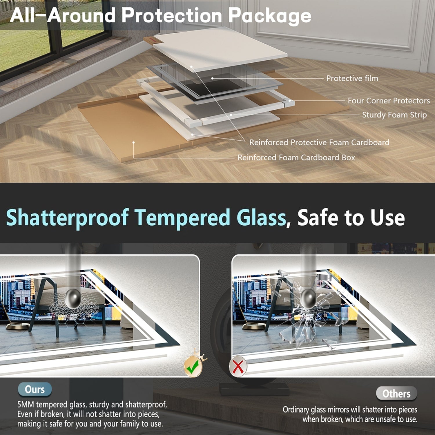 - High-quality Light Strips: our LED mirror adopts 24-Volt output voltage super-bright real CRI90+ 192 LEDs/m light strips, compared with others' 12-Volt low-power light strips, which are bright enough for makeup, shaving and skin care and longer lifespan.