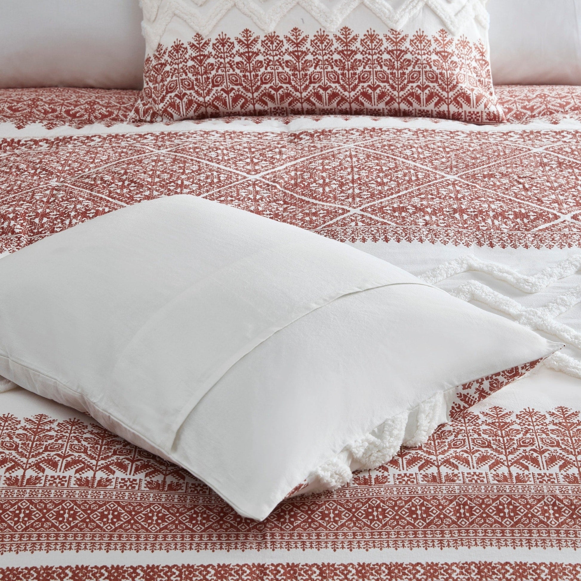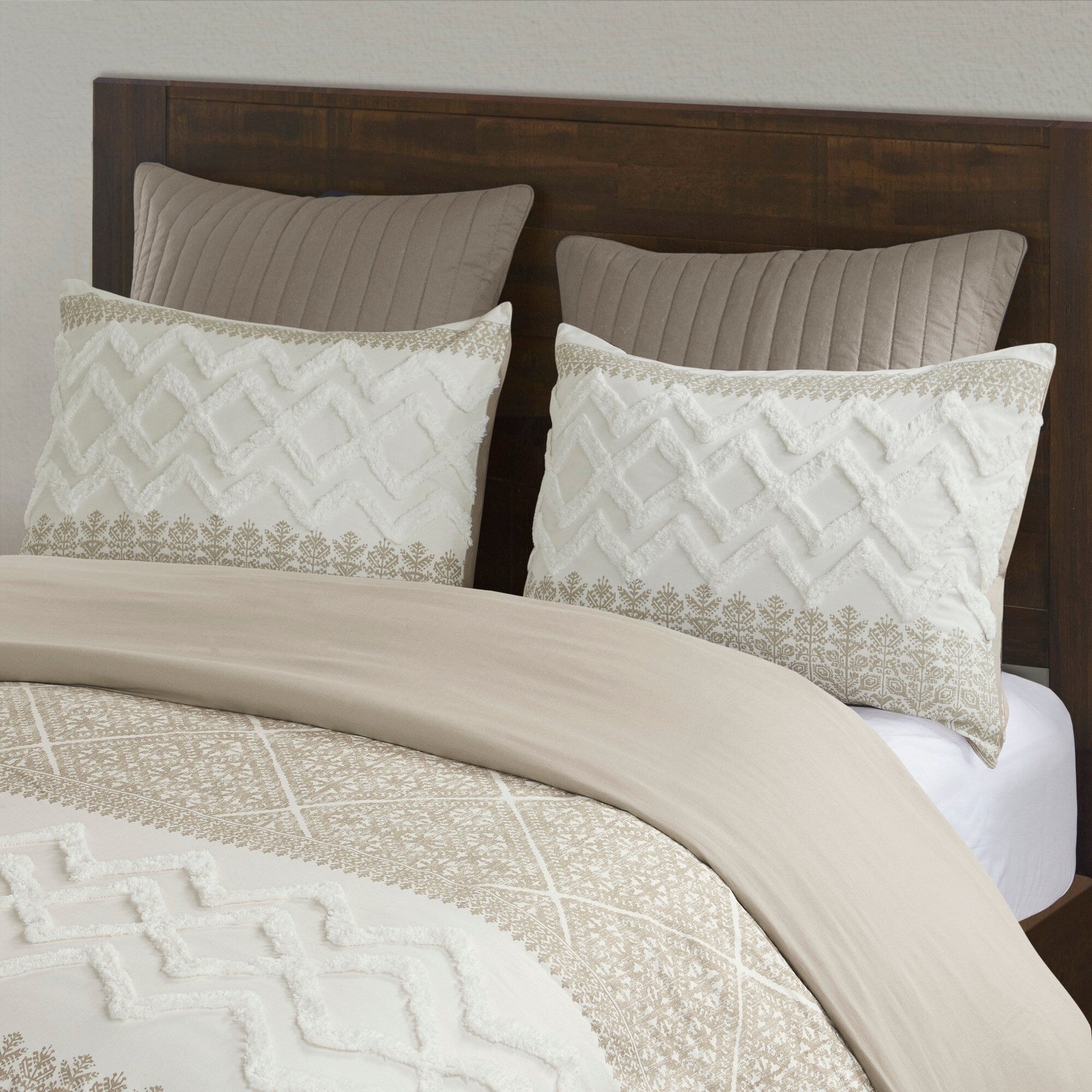 Transform you bedroom with the charming shabby chic allure of the INK+IVY Mila 3 Piece Cotton Duvet Cover Set with Chenille Tufting. The cotton duvet cover flaunts an updated taupe botanic print, on a natural white ground, with tufted white chenille, in a chevron design, to create a charming farmhouse look. A solid reverse complements the top of the duvet cover, while two matching shams beautifully mimic the design on top of the bed, completing the farmhouse duvet cover set. Machine washable, this cotton tufted duvet cover set offers soft comfort and a vivid touch that elevates your bedroom decor. Button closures allow you to place a comforter insert within the duvet cover and inside corner ties help prevent it from shifting. Insert is NOT included. This duvet is OEKO-TEX certified, meaning it does not contain any harmful substances or chemicals to ensure quality comfort and wellness.