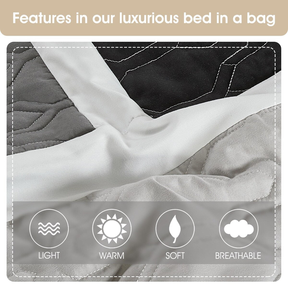 Transform your bedroom into a cozy and elegant sanctuary with the Nanshing Blake 7 Piece Comforter Set. Made of high strength 100% polyester fabric and filling, this bedding set flaunts excellent workmanship and quality with its beautiful geometric patterns in 3 different tones. The set includes one comfortable comforter, two shams, one solid bed skirt, and three plushy pillows, all made to last and designed to provide you with a complete bedroom makeover. The bedding set is easy to maintain with a gentle machine wash and low tumble dry setting.