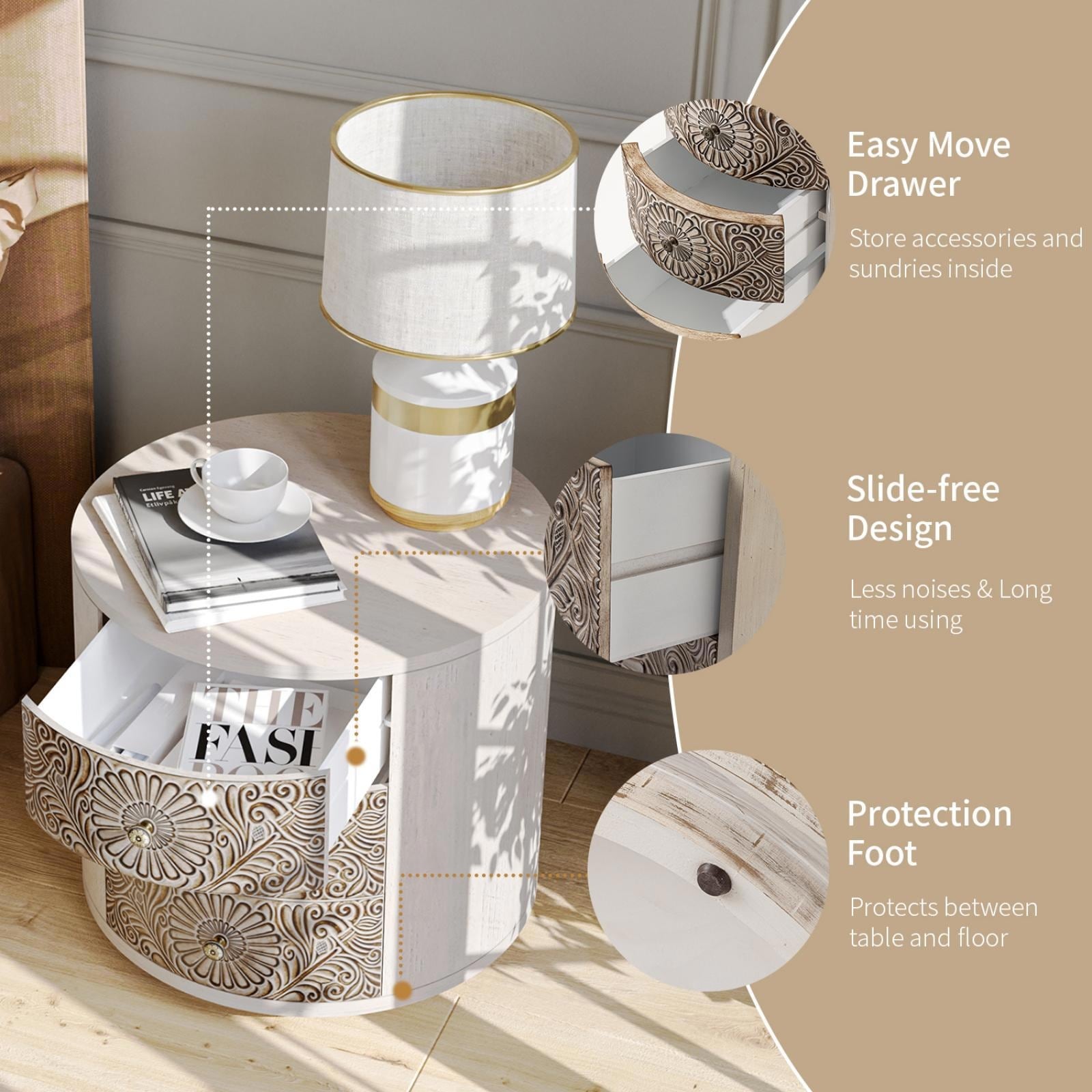 Introduce a touch of vintage charm to your room with the COSIEST Vintage Brown Pattern Solid Wood end table with Drawer. The end table is perfectly designed to fit narrow spaces and features a uniquely crafted drawer that offers extra storage space for your essentials. The lower shelf can hold your potted plants, books, or other decorative items. This end table is constructed from high-quality MDF and pine wood with a light grey leg and brown pattern color that blends in perfectly with different home themes. The smooth edge avoids sharpness, and the drawer pull handles are made of antique grey tone finished metal.