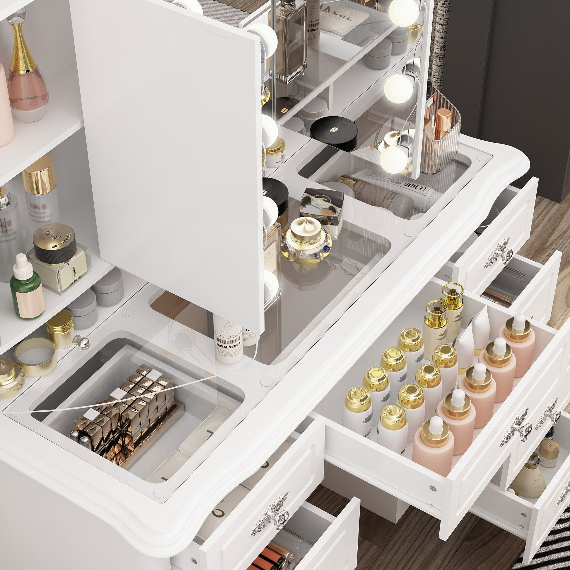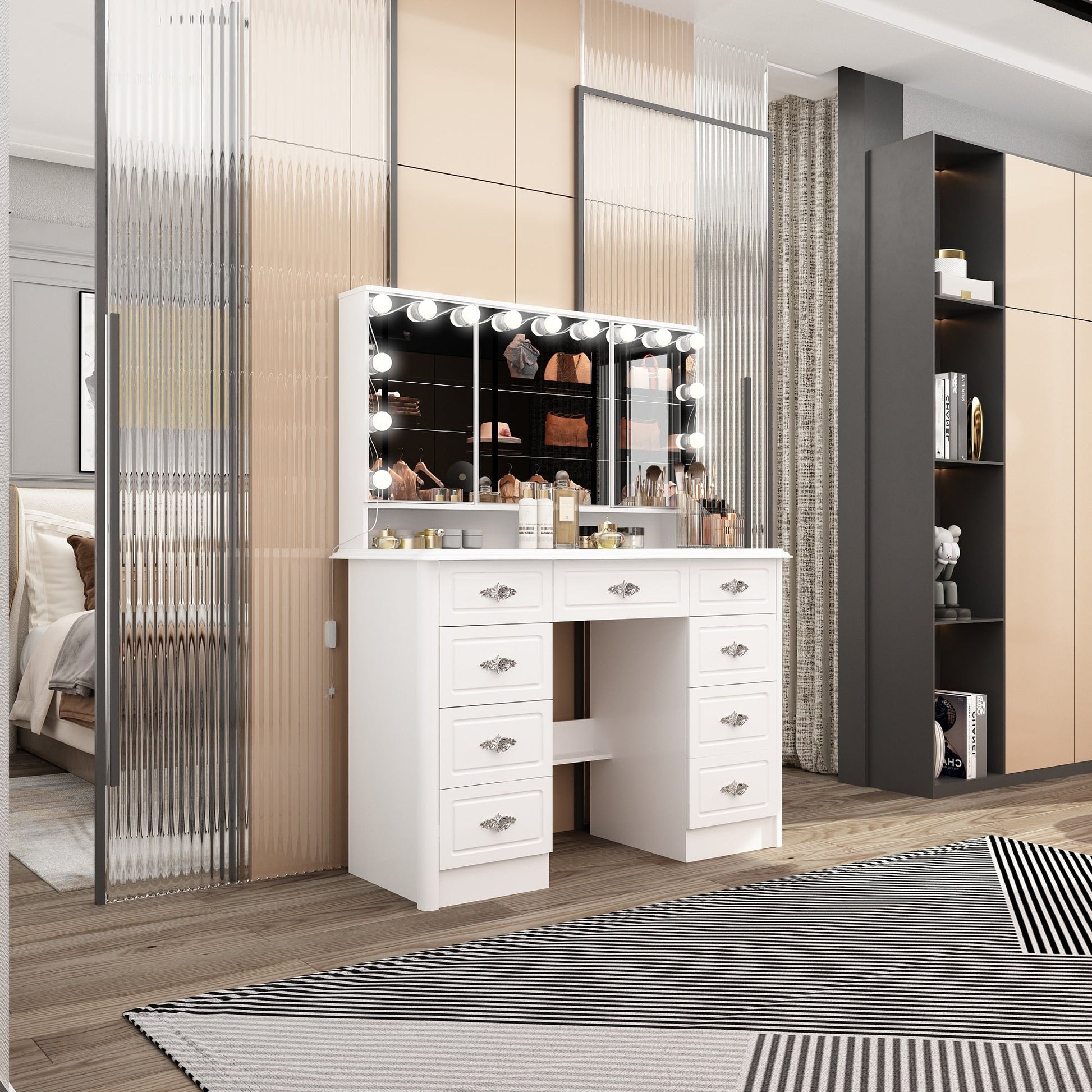 Coiffeuse blanche élégante avec miroir à trois volets et éclairage réglable