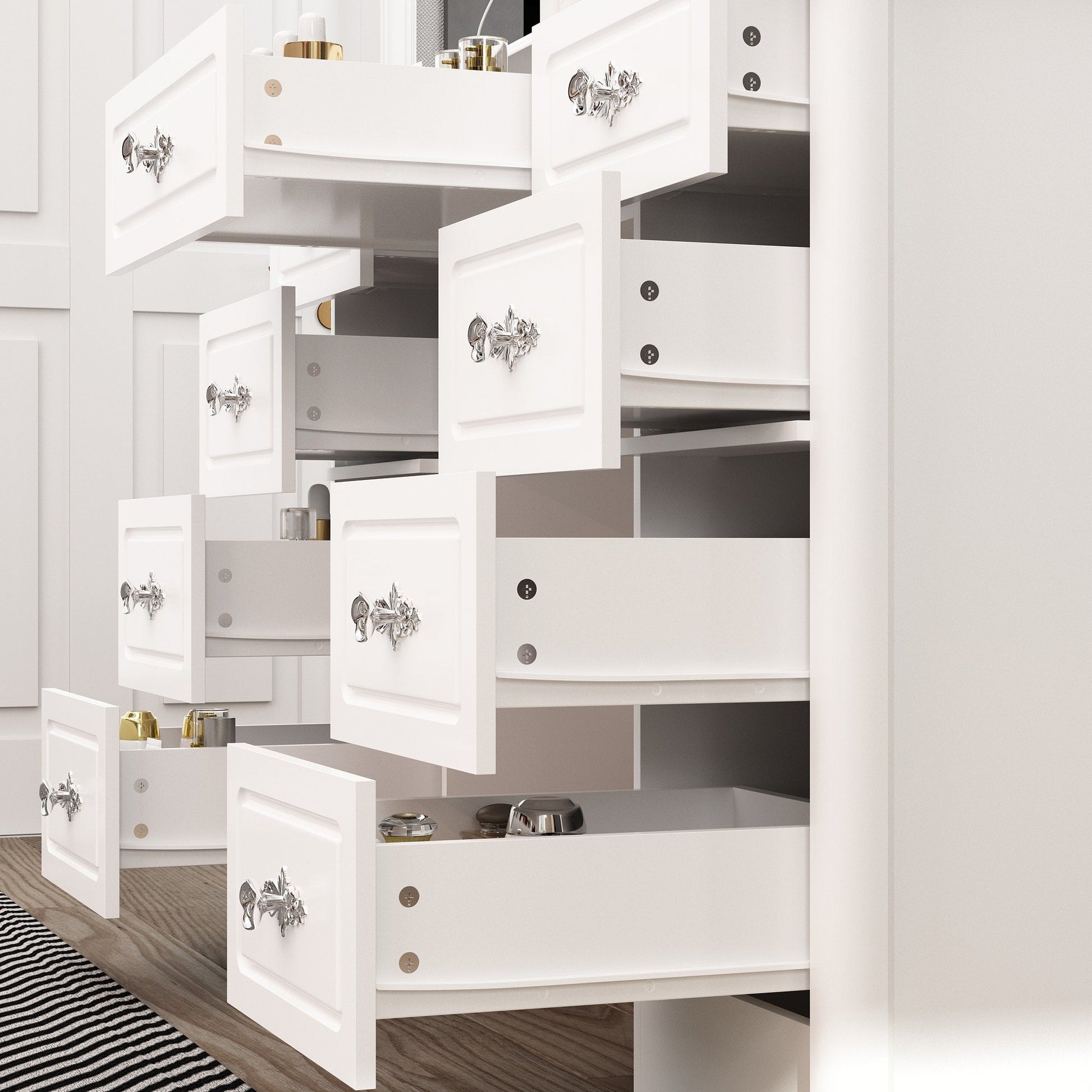 Conception des tiroirs : les tiroirs sont équipés de glissières silencieuses blanches de 14 pouces pour un fonctionnement fluide et silencieux.