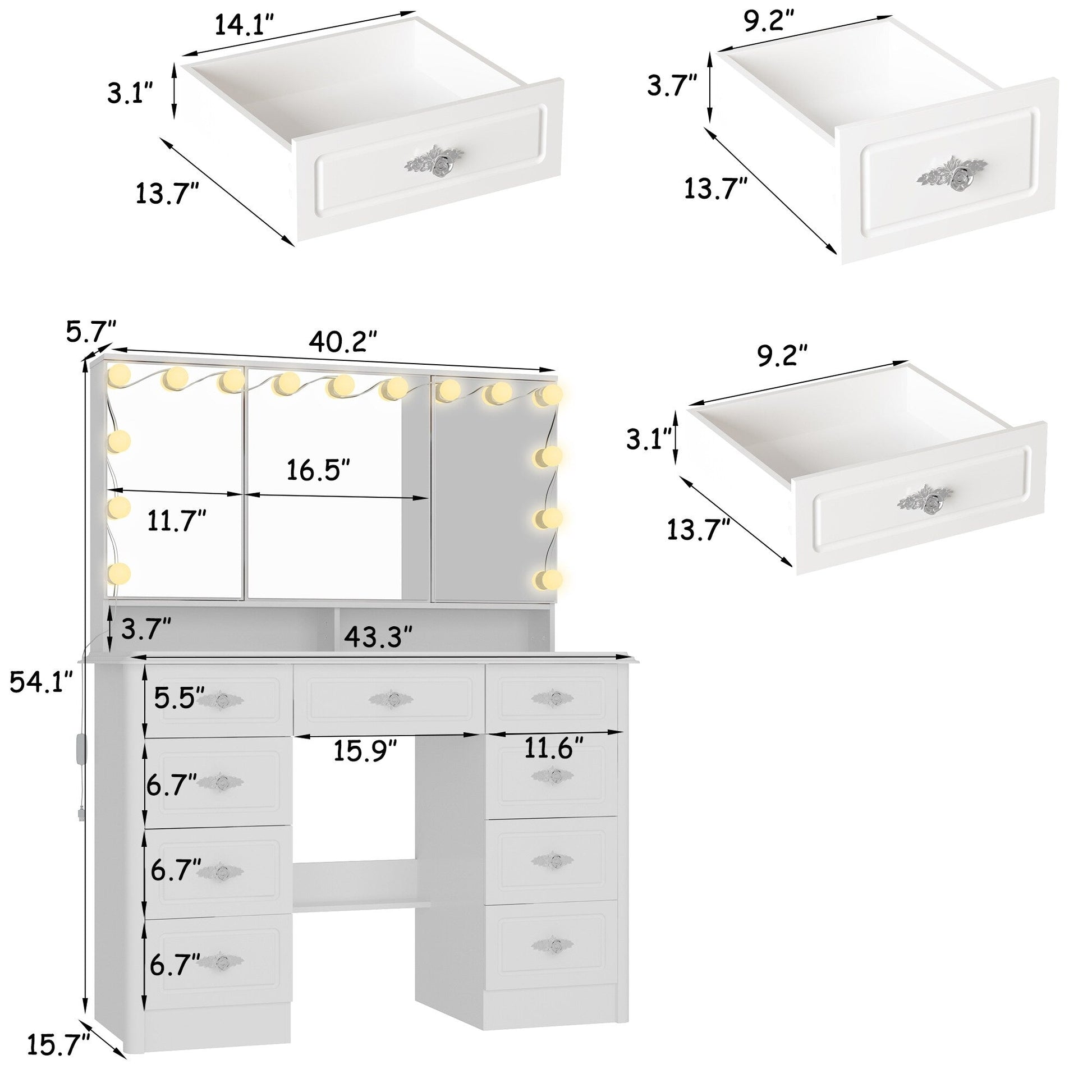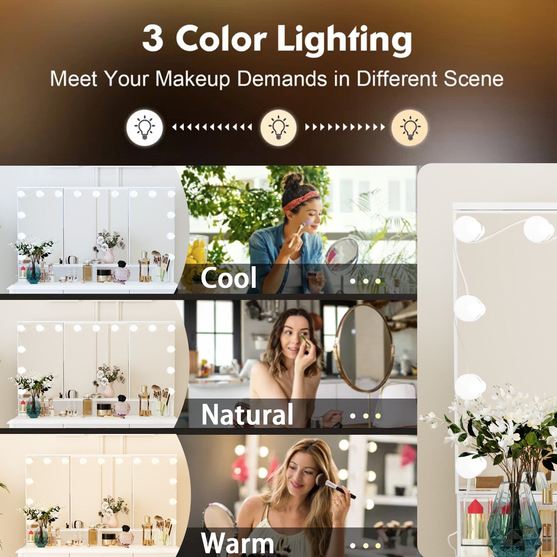 Miroir triple volet : Profitez du confort d'un miroir triple volet doté d'une couronne d'ampoules tricolores (lumière chaude, lumière du jour, lumière froide). Illuminez votre coiffeuse avec un jeu de 15 ampoules certifiées de 0,5 W chacune. L'interface USB offre un confort d'utilisation optimal, sans adaptateur secteur.