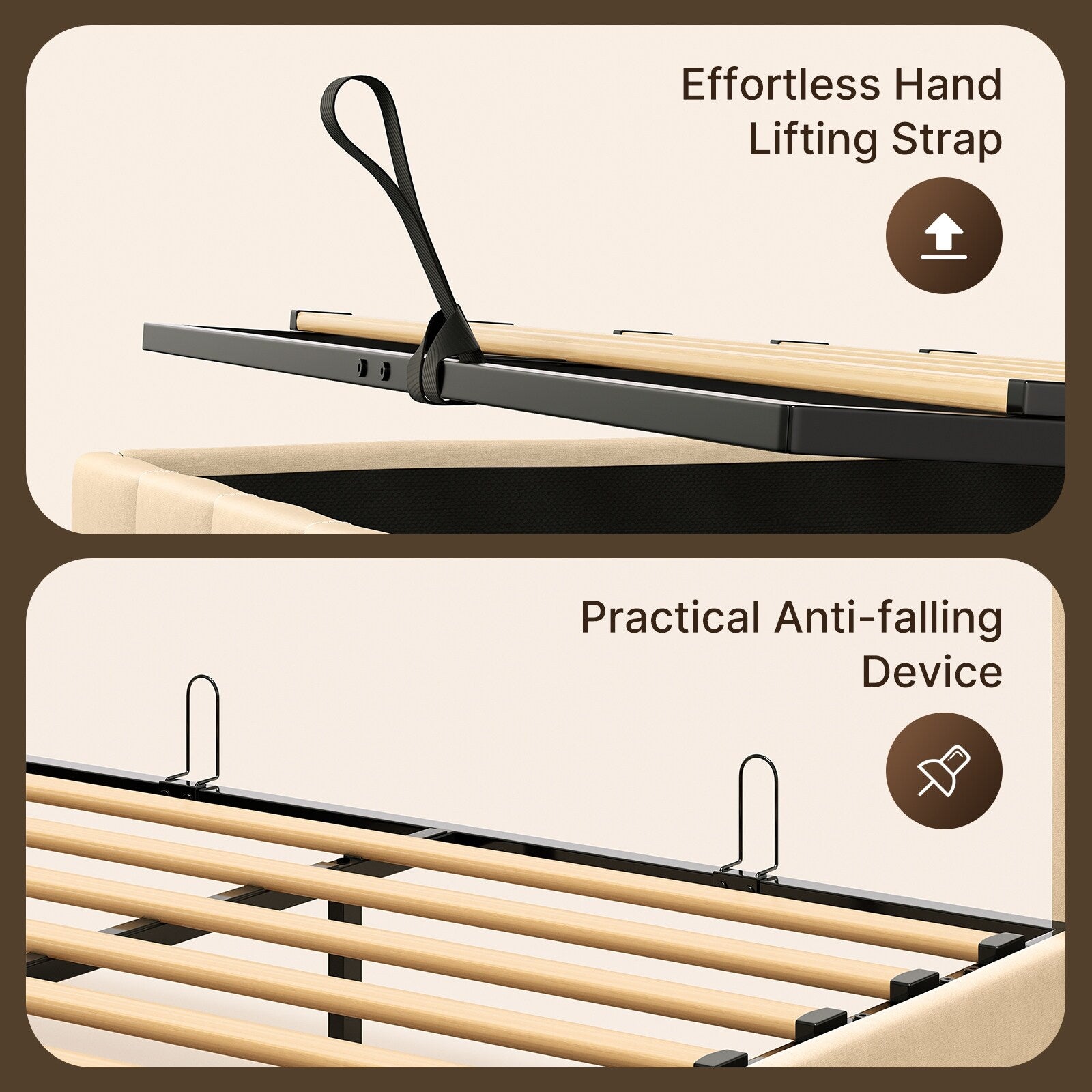 • Rangement maximisé : Le mécanisme de levage offre un grand espace de rangement pour la literie, les vêtements, les chaussures ou tout autre article que vous souhaitez garder hors de vue, contribuant ainsi à désencombrer votre chambre.