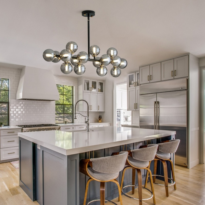 Ajoutez une touche de sophistication à votre espace avec ce lustre Spoutnik à 16 lumières. Disponible en laiton, ambre, gris fumé et gris fumé laiteux, ce lustre en laiton est doté de tiges métalliques linéaires et d'abat-jour globe en verre dépoli blanc, le tout en laiton satiné pour un style intemporel. Le lustre ambre est doté d'une élégante structure métallique linéaire et d'abat-jour globe en verre ambré transparent, sublimant votre espace. Le lustre gris fumé, quant à lui, est doté d'une structure métallique linéaire et d'abat-jour globe en verre fumé, créant une allure élégante. Son design à la fois simple et raffiné, et ses abat-jour sphériques assurent un éclairage doux et uniforme, faisant de ce lustre Spoutnik un excellent choix pour un éclairage aussi fonctionnel que décoratif. Il s'intègre parfaitement à tous les styles de pièces, du moderne au rétro en passant par l'industriel. Idéal pour votre salon, salle à manger, chambre ou cuisine.