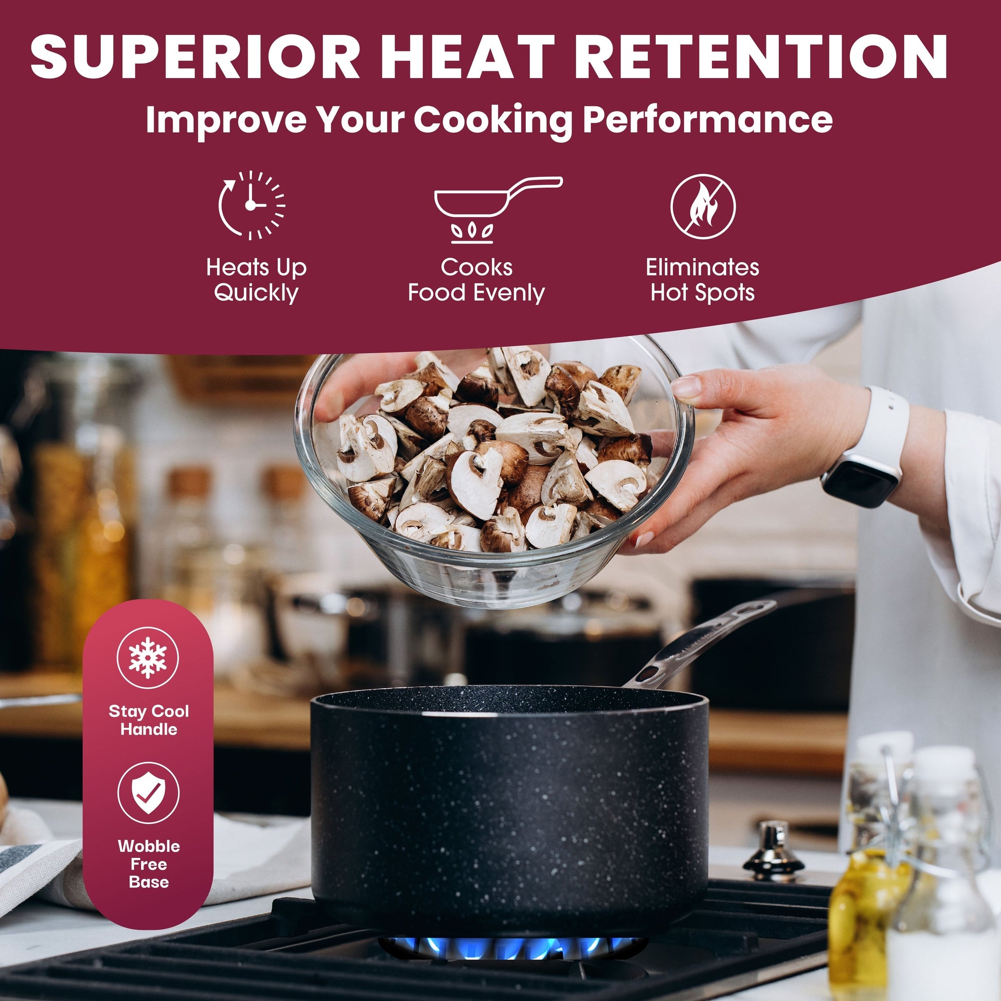 - Sûr et adapté à la famille : fabriqué sans PFOA, PFOS, plomb ou cadmium pour une tranquillité d'esprit ; les poignées qui restent froides et les bases sans oscillation ajoutent sécurité et stabilité à chaque séance de cuisson.