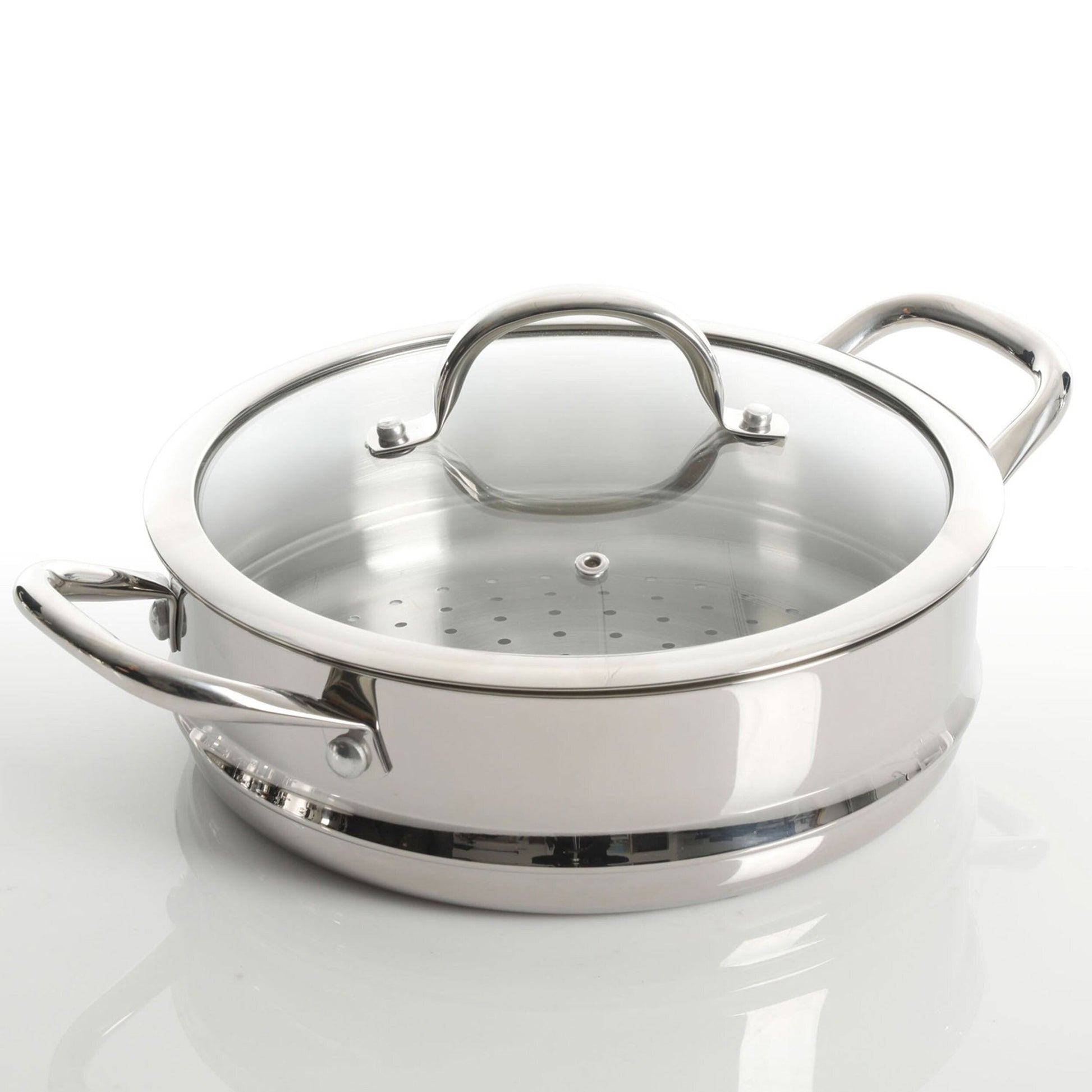 Cuisinez et créez vos plats les plus originaux avec cette batterie de cuisine 10 pièces en acier inoxydable épais. Fournissant tout le nécessaire, cette batterie de cuisine permet aux chefs de tous niveaux de frire, sauter, saisir, cuire à la vapeur, bouillir et cuire au four. Leur corps en acier inoxydable épais est compatible avec toutes les plaques de cuisson. La cocotte et les poêles sont équipées de couvercles en verre résistant à la chaleur avec évents pour une surveillance facile de la cuisson ! Cuire des légumes à la vapeur, faire sauter des nouilles, faire frire du poulet, remuer des sauces tomates savoureuses et plus encore. Ensemble : Batterie de cuisine Matériau : acier inoxydable épais Finition : polie Poignées : acier inoxydable Compatible avec toutes les plaques de cuisson Lavage à la main uniquement L'ensemble comprend : Une casserole de 1 pinte avec poignée et couvercle de 6,25 pouces Une casserole de 2,5 pintes avec poignée et couvercle de 7 pouces Une poêle à frire de 9,5 pouces avec poignée de 7,25 pouces Un panier vapeur avec poignées de 2 pouces Une sauteuse de 4,4 pintes avec poignées de 8,5 pouces et 2 pouces et couvercle Une cocotte de 5 pintes avec poignées et couvercle de 2 pouces Dimensions par article : Casserole de 1 pinte : 12,25 pouces de longueur, 6 pouces de largeur, 3 pouces de hauteur, capacité de 1 pinte, poids de 1 lb Casserole de 2,5 pintes : 14,25 pouces de longueur, 7,75 pouces de largeur, 4 pouces de hauteur, capacité de 2,5 pintes, 1,75 lb Poêle à frire de 9,5 po : longueur de 17 po, largeur de 10 po, hauteur de 2,25 po, capacité de 48 oz, poids de 2 lb. Insert de cuisson à la vapeur : longueur de 14 po, largeur de 10 po, hauteur de 3 po, poids de 1 lb. Sauteuse de 4,4 pintes : longueur de 22 po, largeur de 11,5 po, hauteur de 3 po, capacité de 4,4 pintes, poids de 3,55 lb. Faitout de 5 pintes : longueur de 13,75 po, largeur de 10 po, hauteur de 4,5 po, capacité de 5 pintes, poids de 2,8 lb.