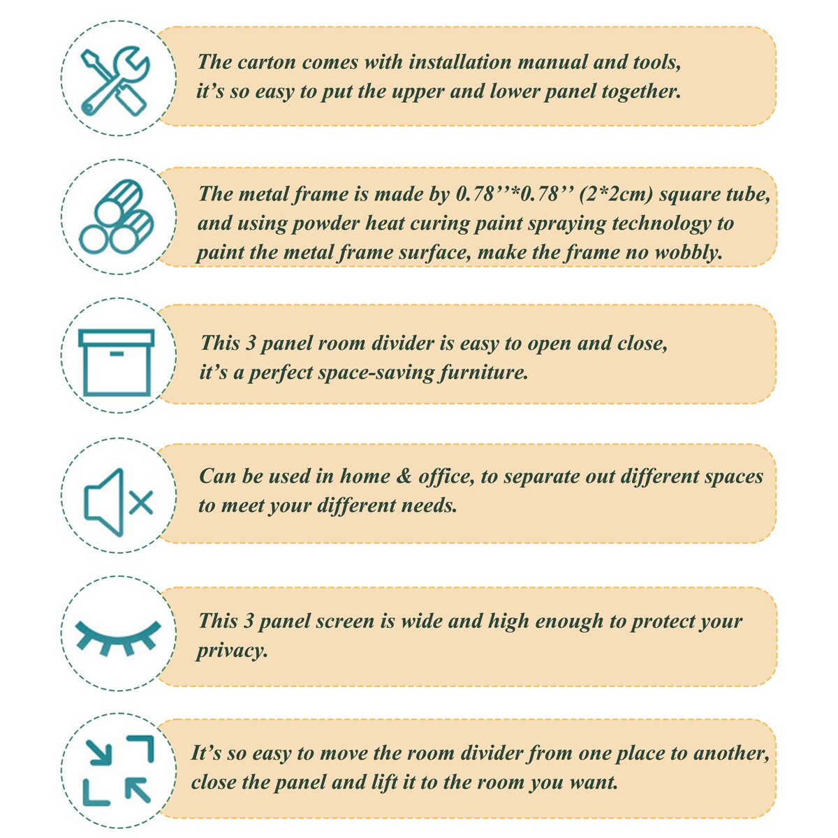 Transformez votre espace de vie avec notre superbe paravent à 3 panneaux, un ajout polyvalent et élégant à votre décoration intérieure. Fabriqué en métal de haute qualité et en bois de paulownia, ce paravent indépendant arbore une esthétique rustique élégante qui s'intègre parfaitement à tous les styles d'intérieur. Idéal pour créer des espaces séparés pour travailler, jouer ou se détendre, notre paravent est incroyablement facile à déplacer et s'adapte à différentes pièces, comme le salon, la chambre, la salle à manger, le bureau et le balcon.