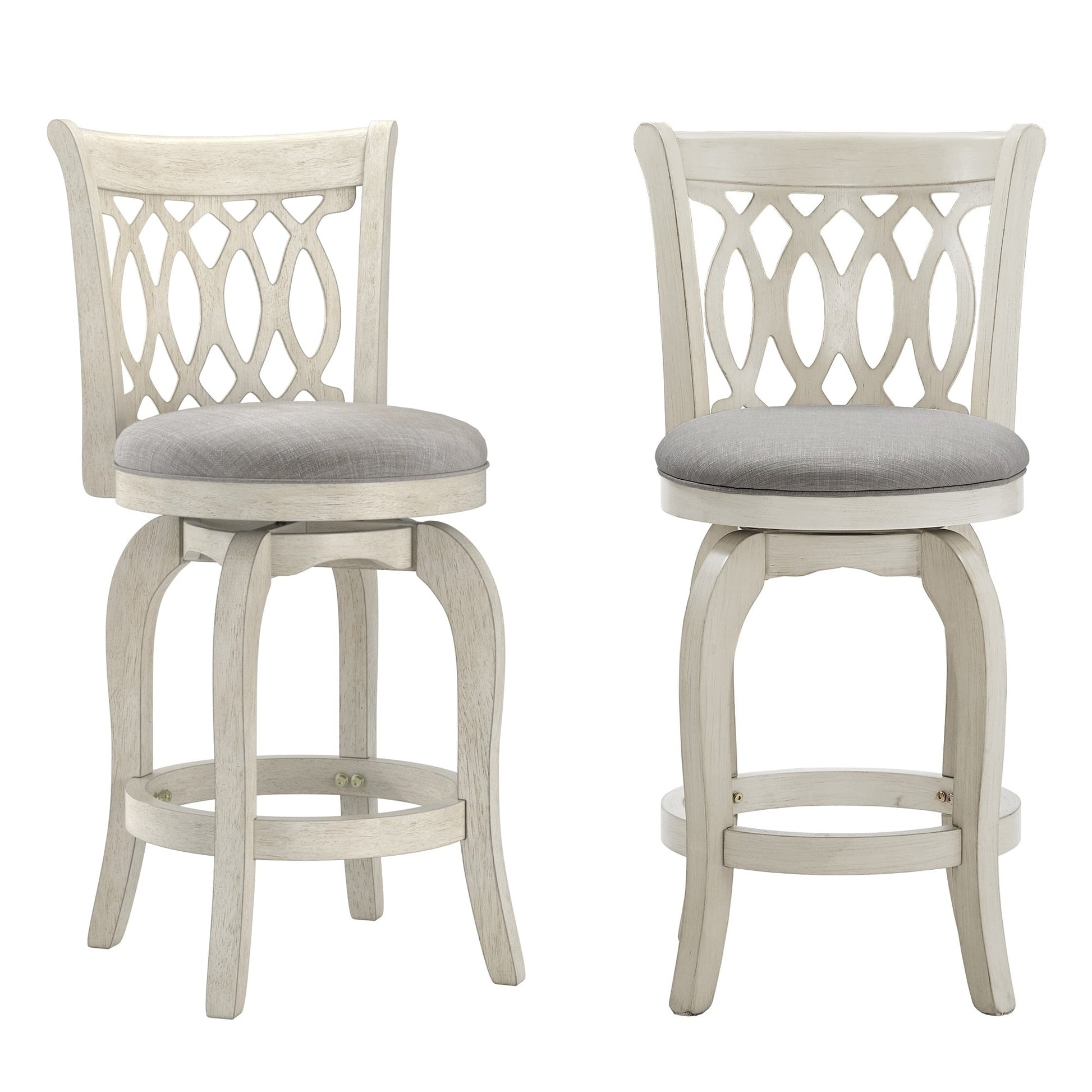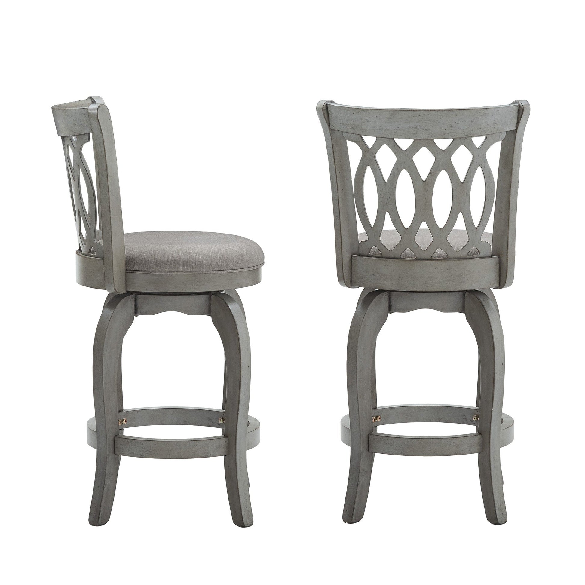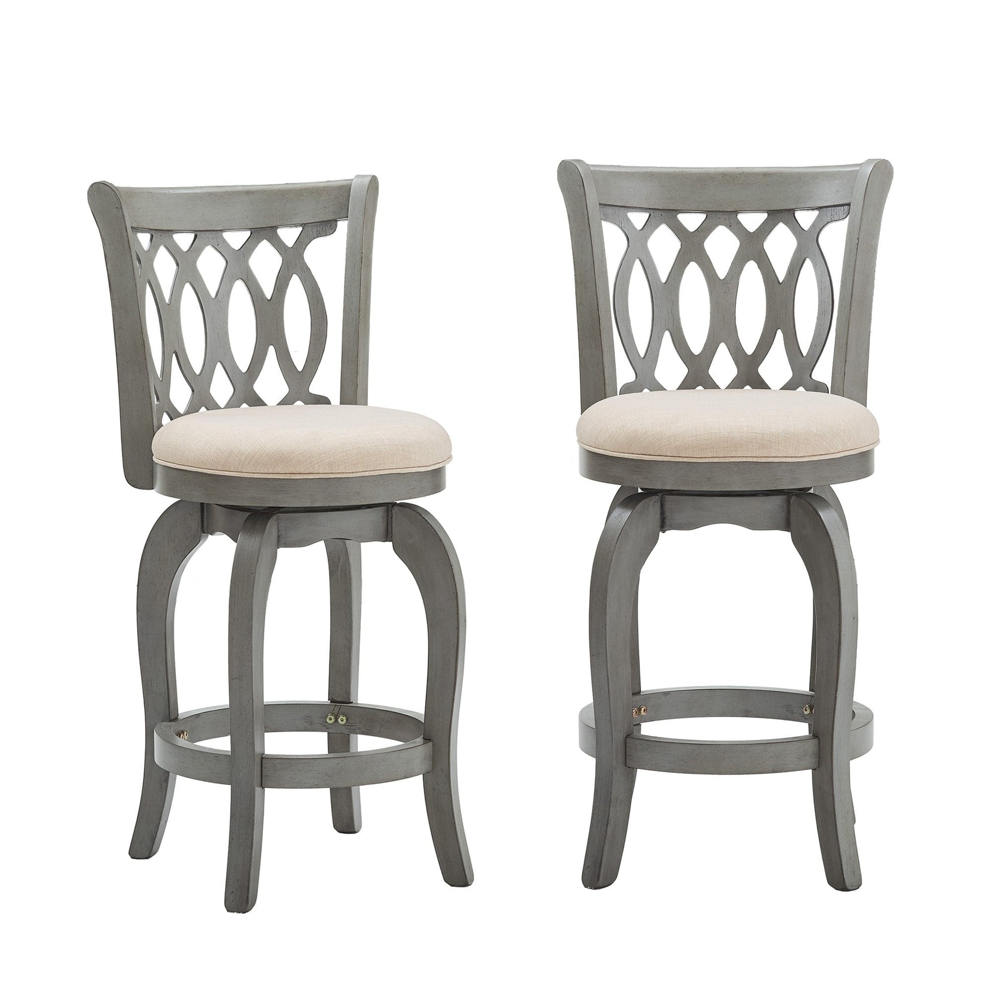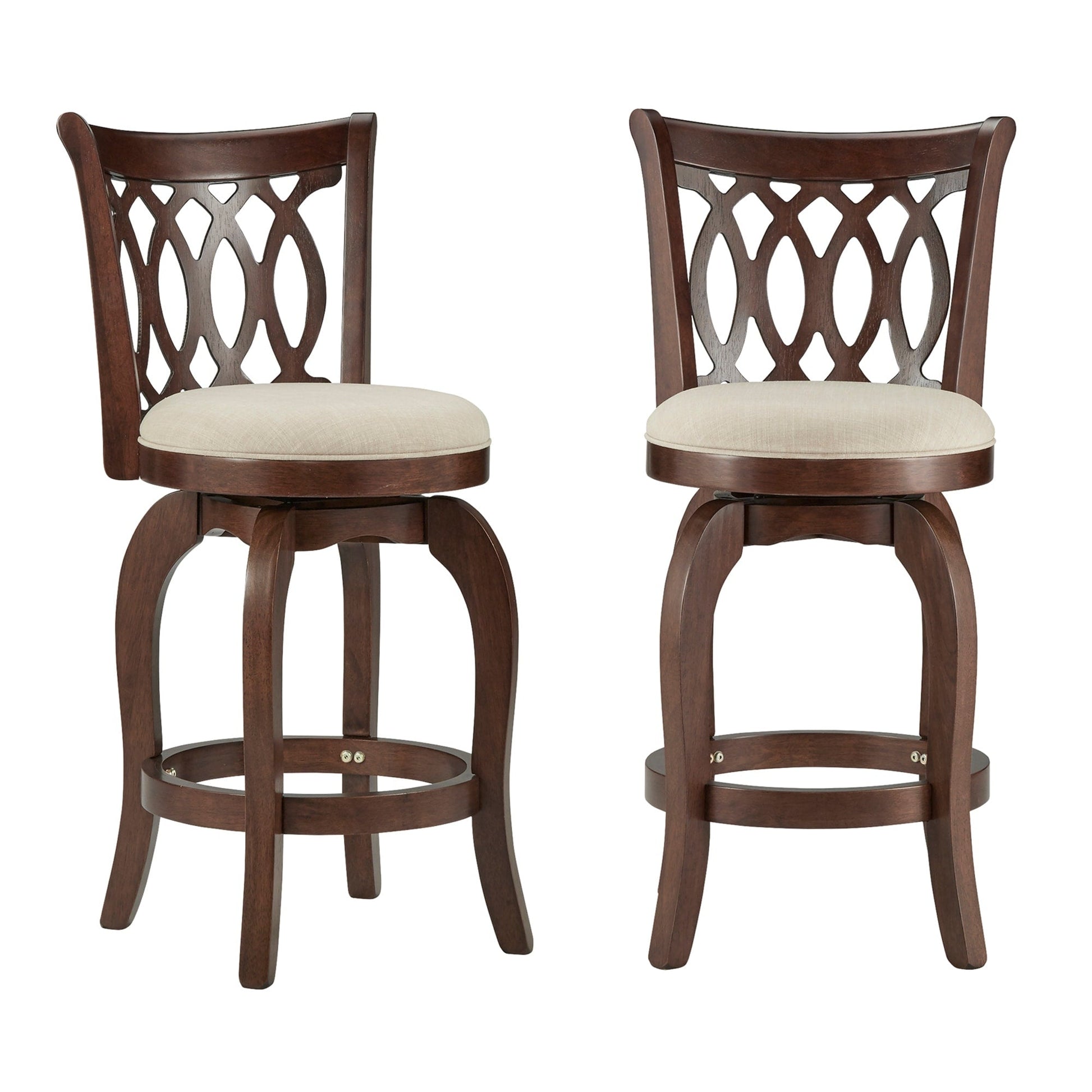 Constructed of durable rubberwood, the Scroll Back Linen Swivel Counter Height Stool displays beautiful, classic style and offers comfortable support for everyday dining. A rich, cherry wood finish completes the chair's frame, while a footrest and an upholstered seat provides improved comfort for daily use. The swivel function of this counter height chair provides advanced mobility and makes it easy to have a casual conversation with friends and family during mealtime. A scroll style back adds beautiful, classic detail to your home, while also offering total support.