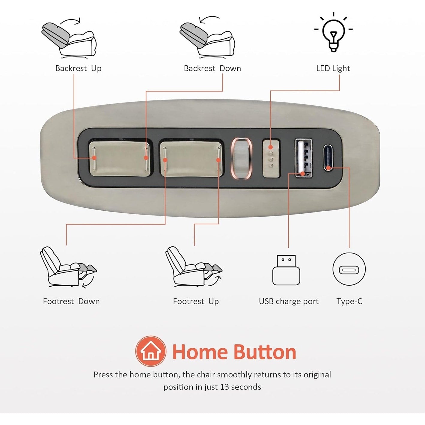 - ONE-TOUCH RESET & LED LIGHTING. Press the home button, and the chair smoothly returns to its original position in just 13 seconds. The dual USB &Type C ports on the armrest support any phone or pad, and LED lighting for added relaxation