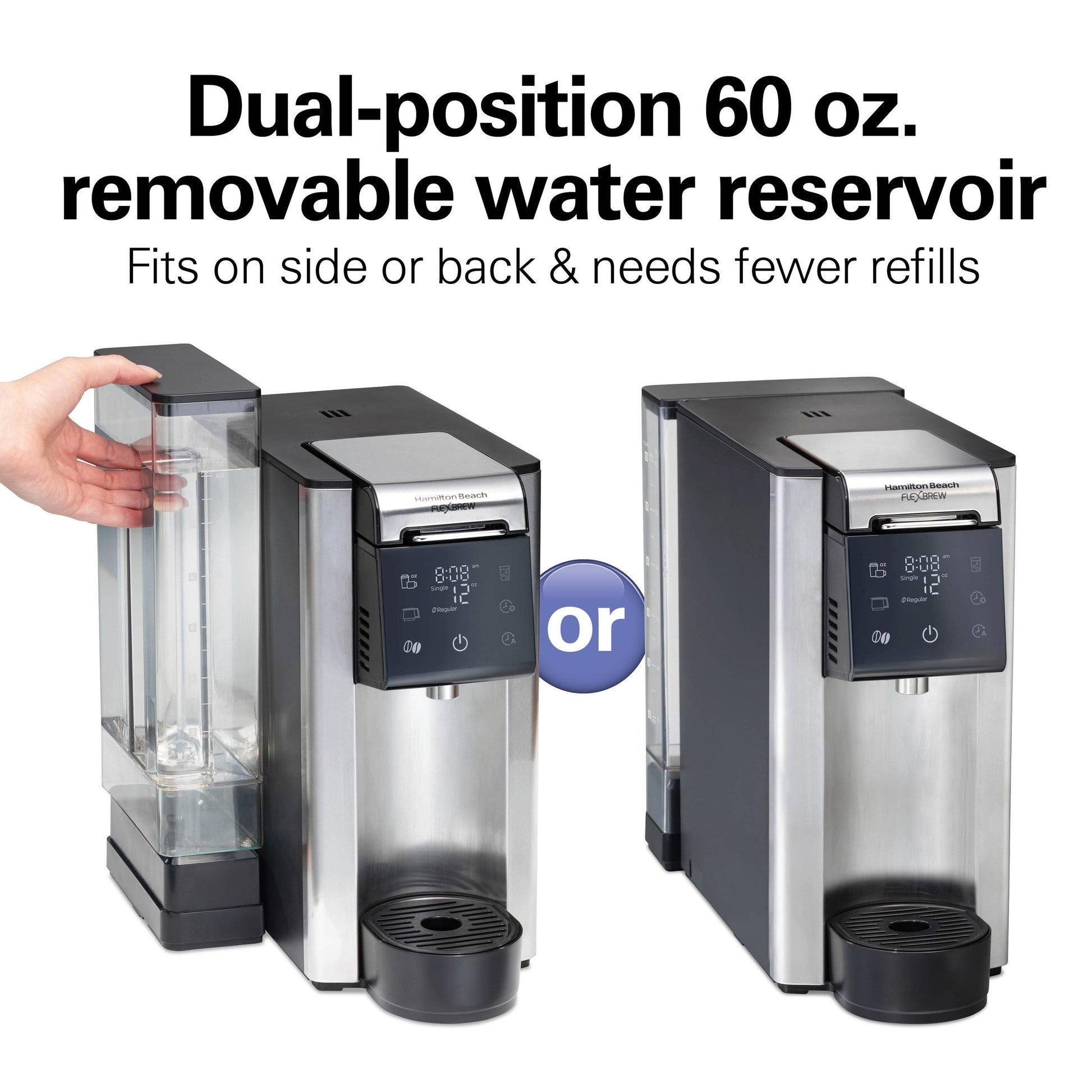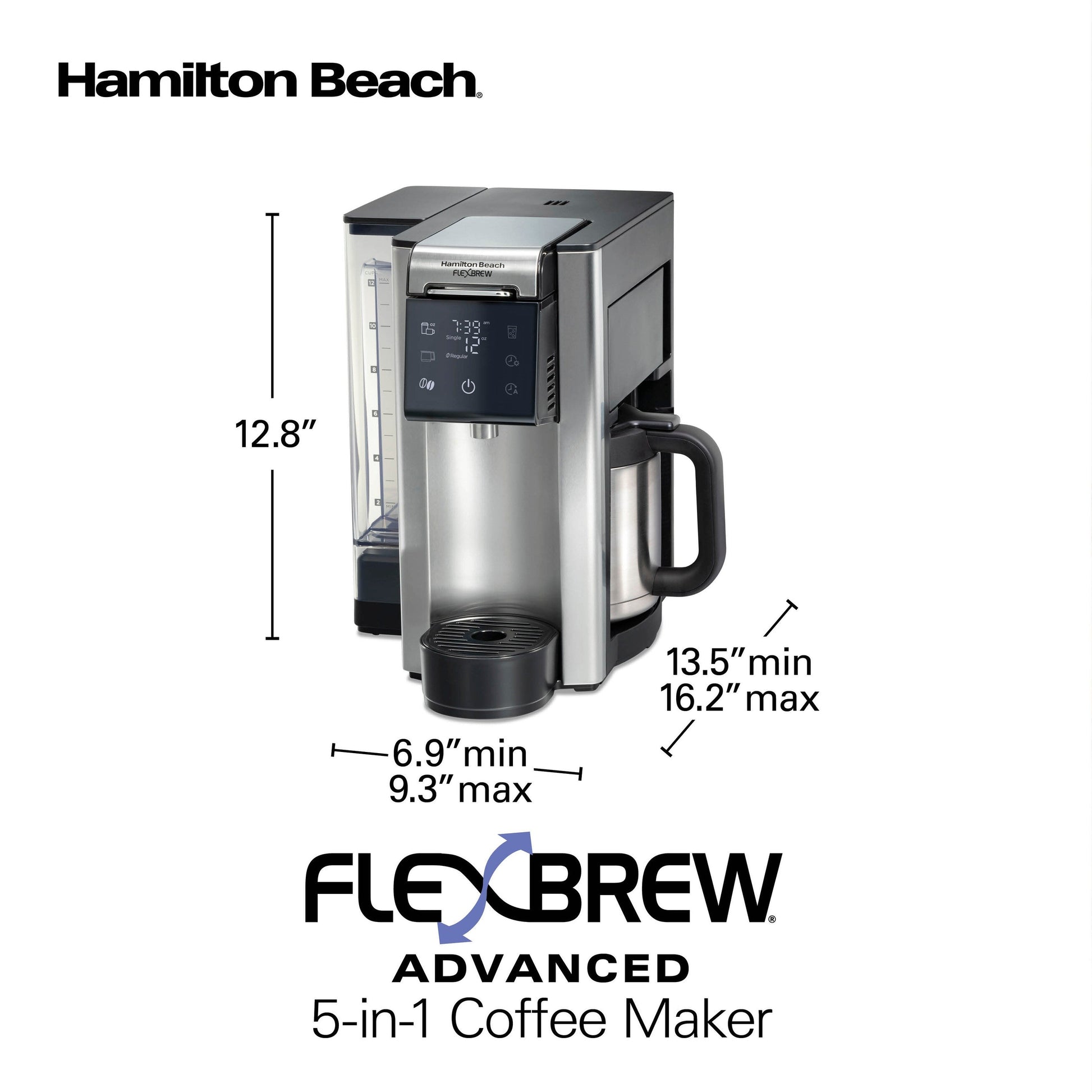 Préparez une tasse de café rapide lors des matins chargés ou remplissez une carafe entière lorsque vous avez plus de temps. La cafetière Hamilton Beach® FlexBrew® Advanced 5-en-1 s'adapte à tous vos besoins et à tous vos horaires de préparation, que vous souhaitiez une tasse de café glacé ou chaud, ou une carafe entière de café chaud. Préparez une tasse de voyage ou une tasse standard avec des dosettes K-Cup®* ou du café moulu. Savourez plusieurs portions de café moulu dans la carafe isotherme de 12 tasses. Quel que soit votre mode de préparation, le grand réservoir d'eau amovible de 1,7 l (1,7 l) nécessite moins de remplissages et offre une double position pour un positionnement à l'arrière ou sur le côté. Placez-le à l'arrière pour un gain de place de plus de 40 %**, ou sur le côté pour un accès facile et un remplissage rapide. Dotée d'un écran tactile LED facile à utiliser avec plusieurs options de préparation et d'un arrêt automatique, elle comprend une carafe isotherme en acier inoxydable de 12 tasses, un réservoir d'eau amovible de 1,7 l (1,7 l), un porte-dosettes et un panier d'infusion pour le café moulu en dosettes individuelles.