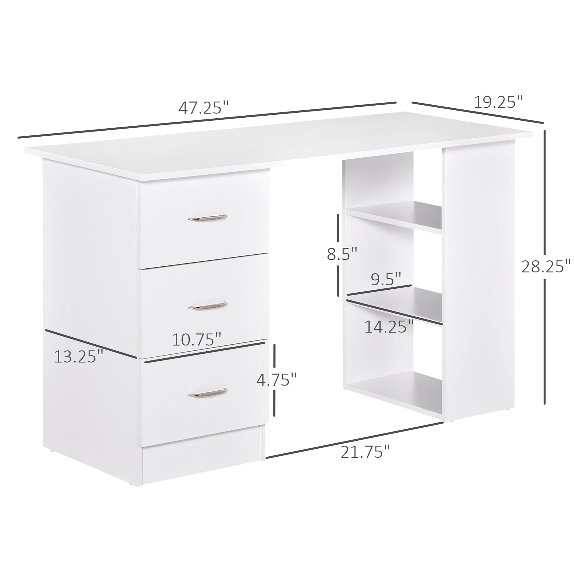 Bureau d'ordinateur moderne HOMCOM 47, bibliothèque, table d'écriture, poste de travail avec 3 tiroirs et étagère de rangement - Blanc