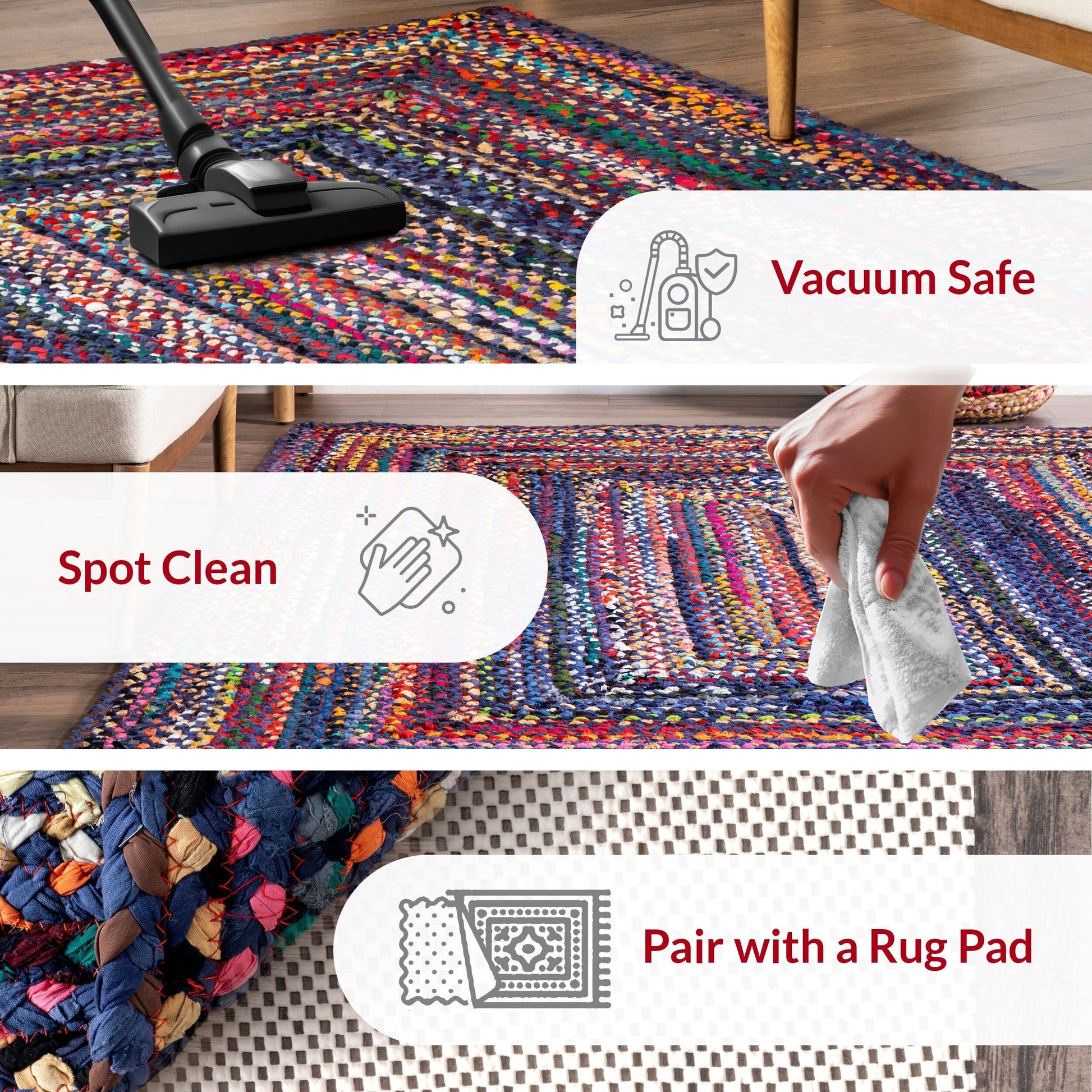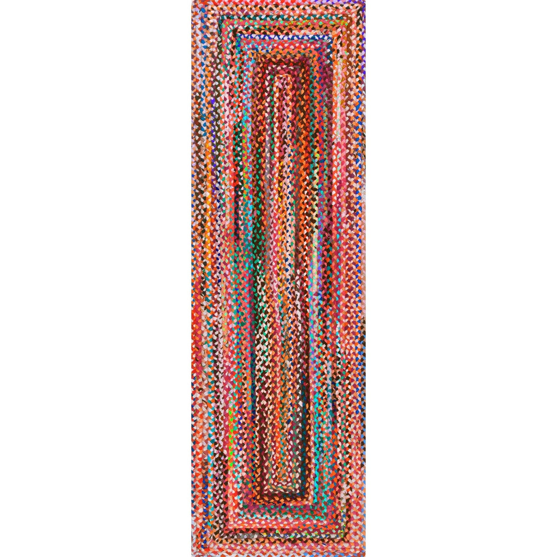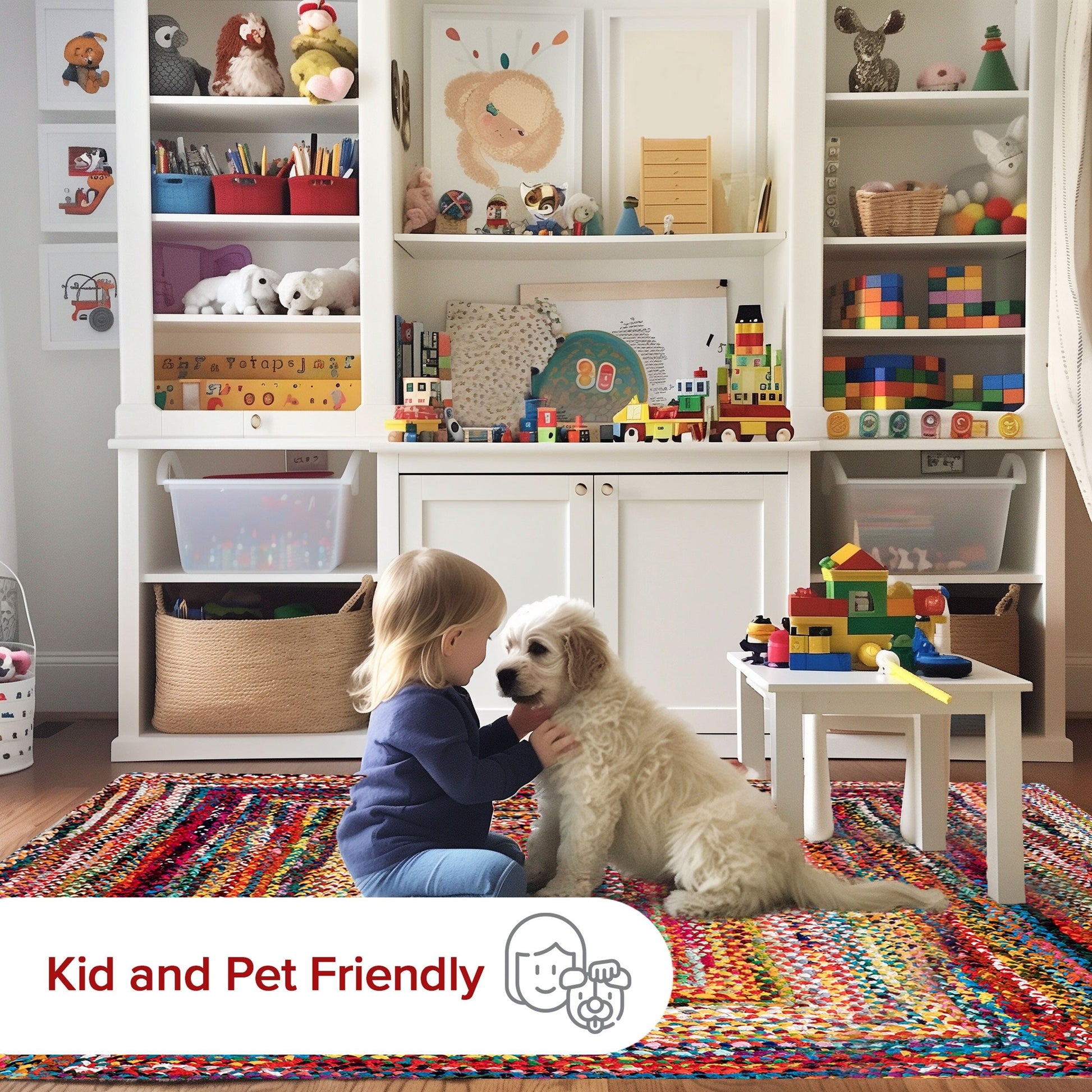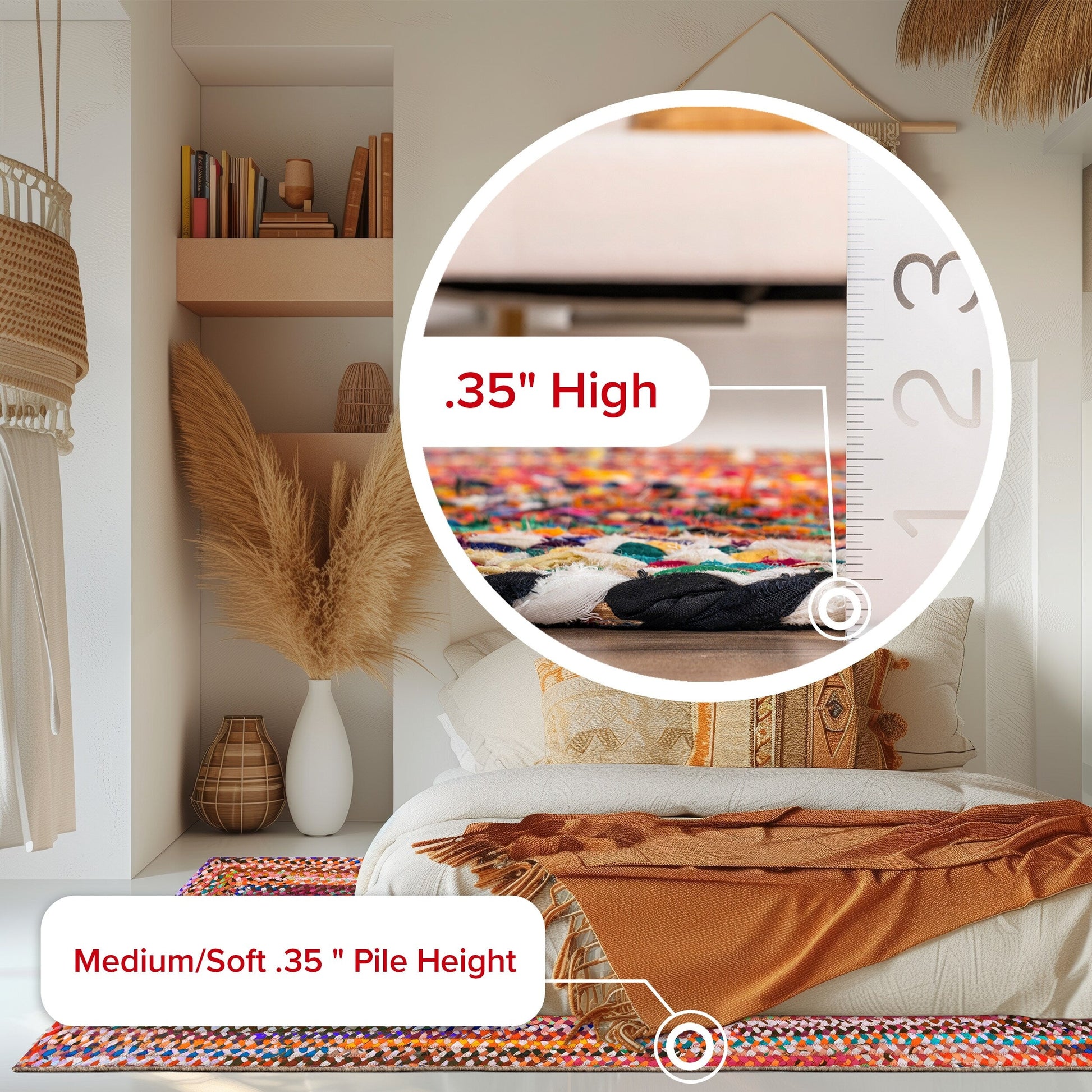 Brighten your room with this distinctively vivid bohemian area rug. Hand braided in India of recycled cotton, each piece carries with it a variation in color and pattern unique to the artisan who made it. This floor covering is the perfect addition to any space in your home that needs a pop of color. Create the home you have always dreamed of with our pet-friendly and easy to care for area rugs.