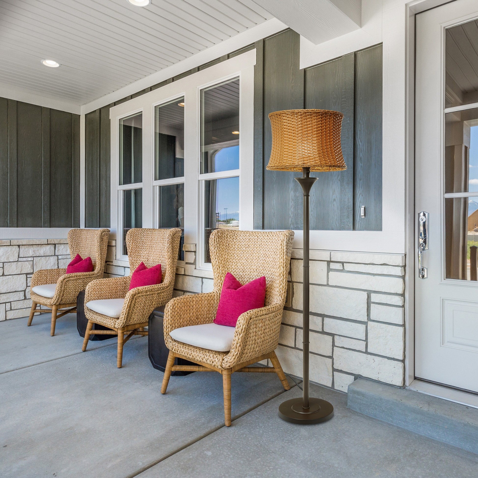 - Basket-woven rattan shade