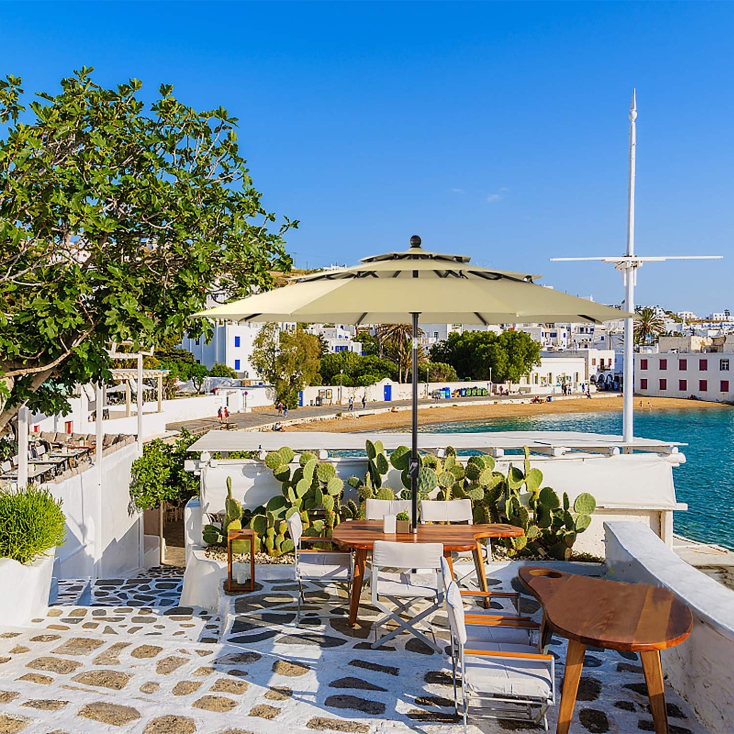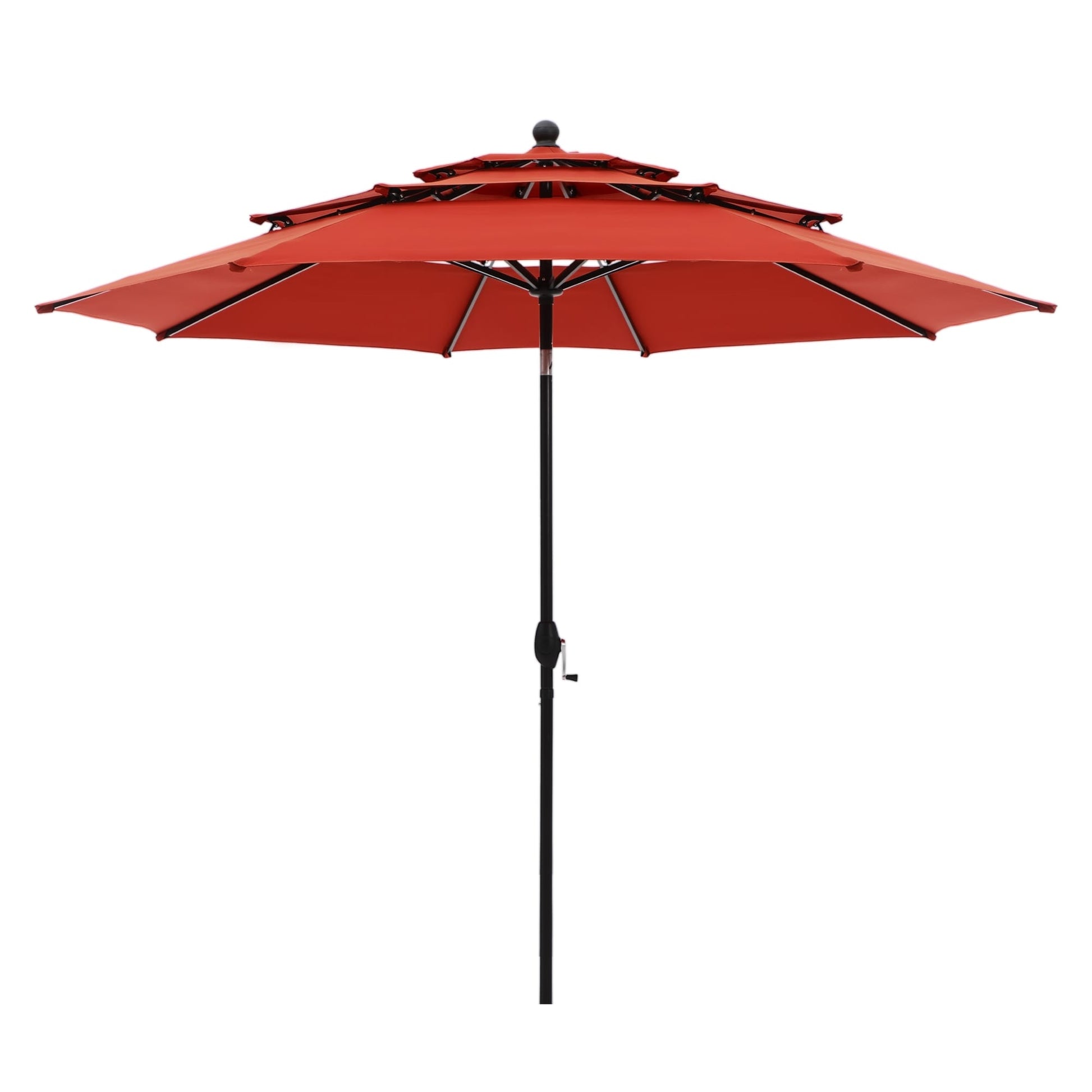 Elevate your outdoor living space with our 10ft 3 Tiers Vented Patio Outdoor Umbrella. With a vibrant color palette and a unique vented design, this umbrella will surely add elegance to any patio or backyard. The breathable yet waterproof fabric provides ample shade and up to 99% UV protection, making it the perfect accessory for sunny days. The umbrella boasts a durable aluminum frame and hand crank for easy operation and an auto-tilt mechanism that allows you to easily adjust the shading angle.