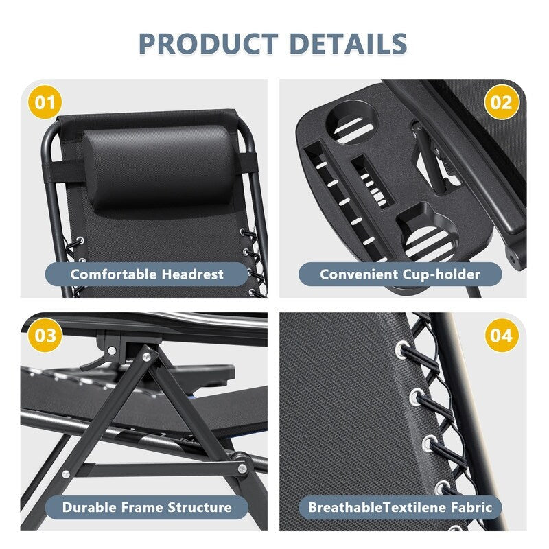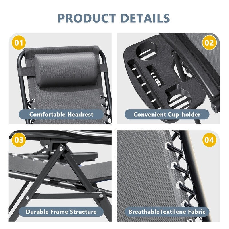 • Ce que nous offrons : Deux chaises de patio zéro gravité, une notice d’installation, notre service après-vente sans souci de 12 mois et un service client convivial.