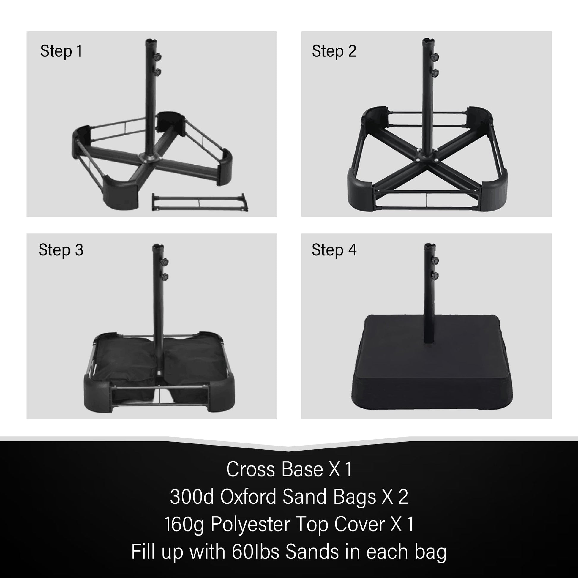 - Base de parasol incluse pour une installation facile : Livré avec une base transversale robuste en acier, deux sacs de sable résistants en tissu Oxford 300D et une housse supérieure en polyester 180G. Nous recommandons d'utiliser 45 kg de sable par sac pour garantir la stabilité.