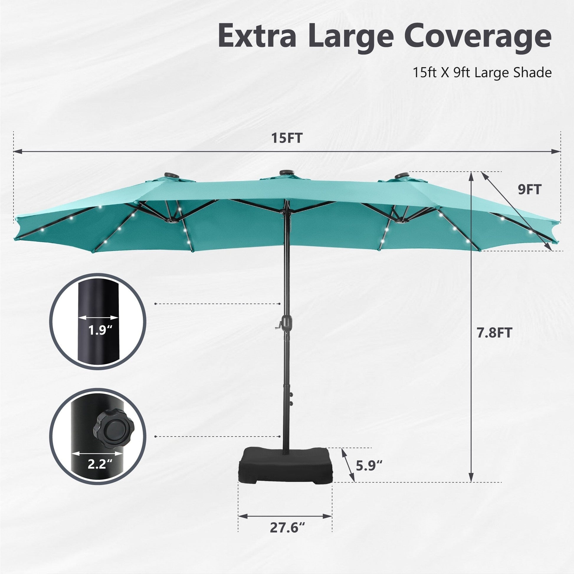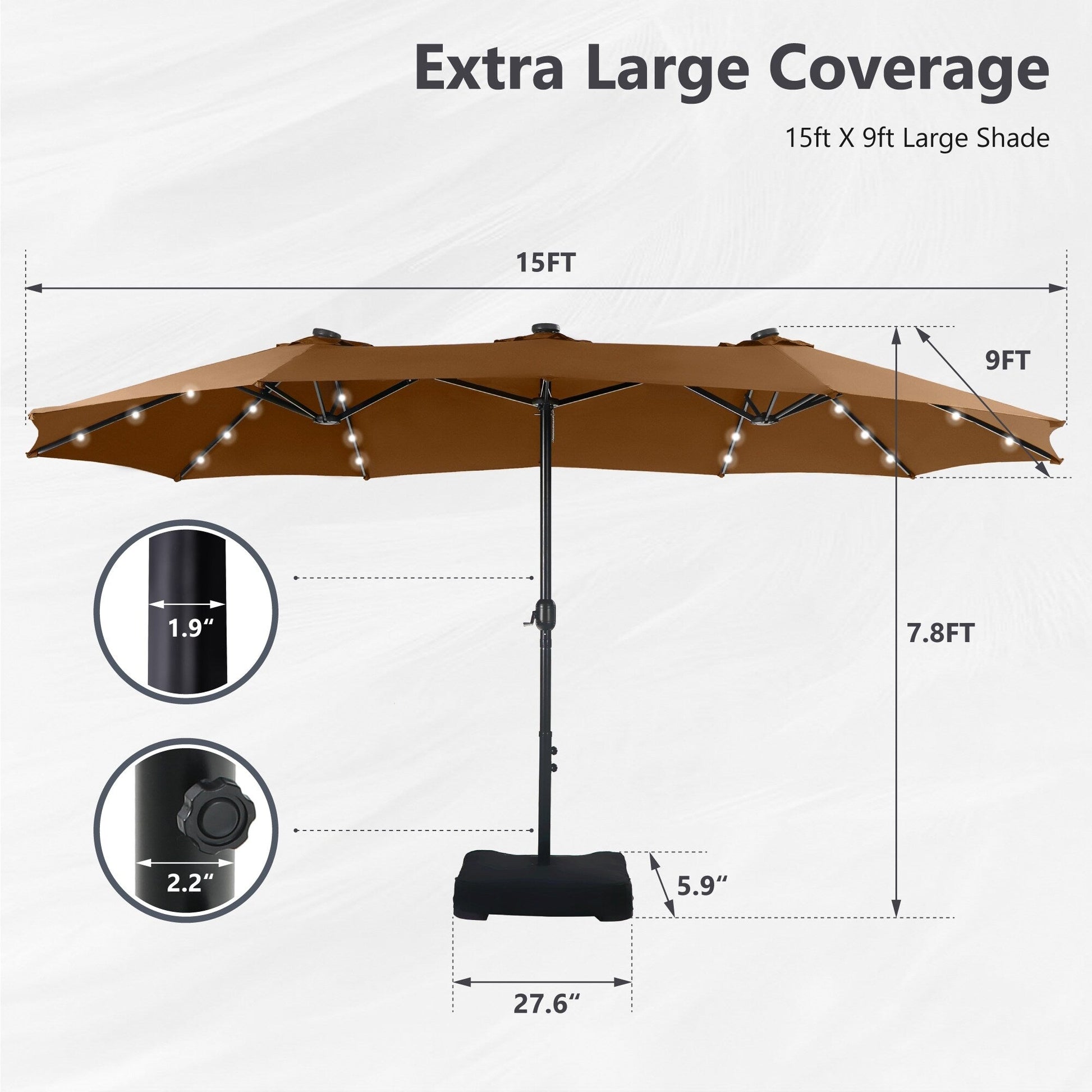 MAISON ARTS Parasol de marché extérieur rectangulaire à manivelle double face de 15 pieds Parasol de patio éclairé par LED solaire avec base incluse