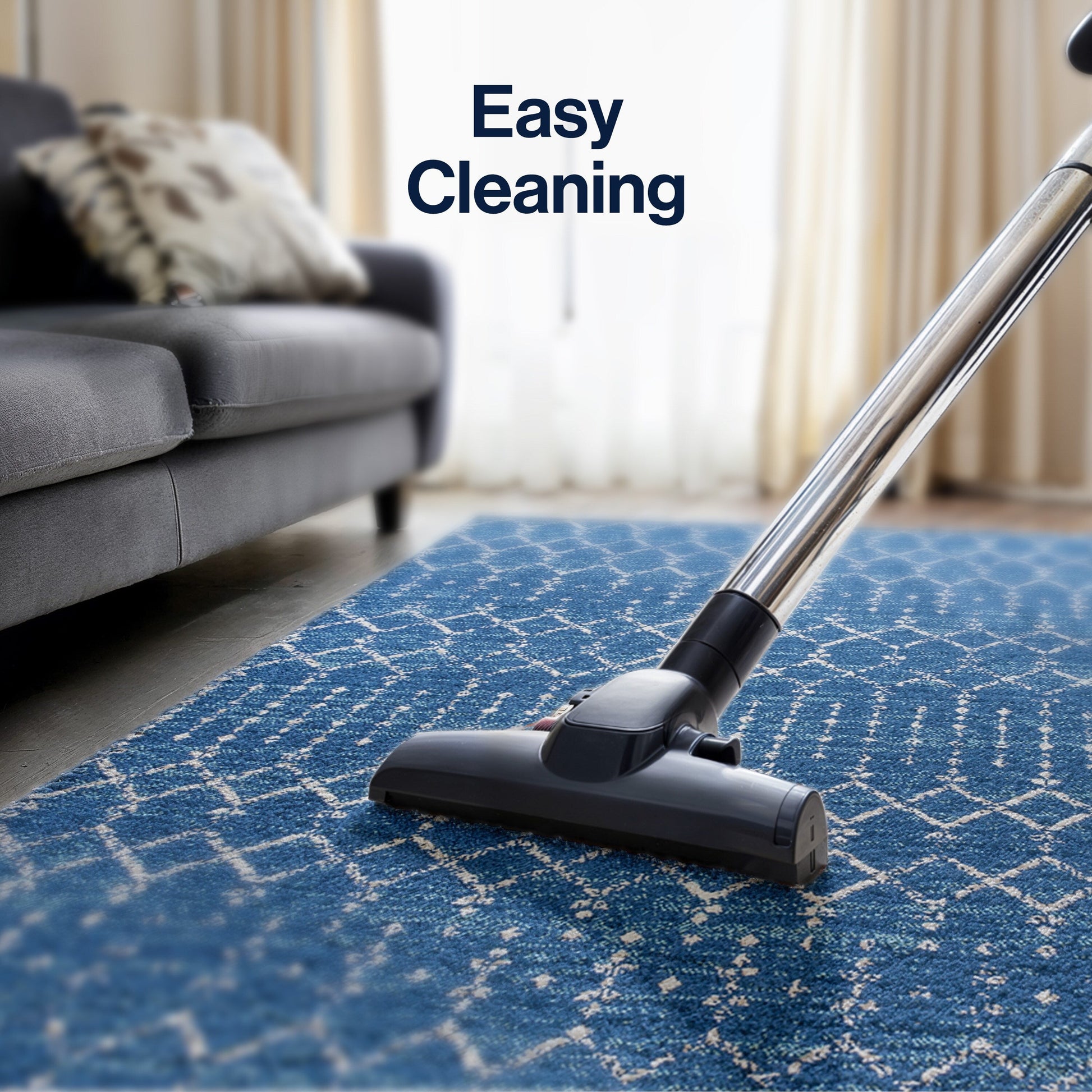 - Un motif géométrique simple dans des tons indigo et ivoire s'harmonise avec tous les styles de décoration.