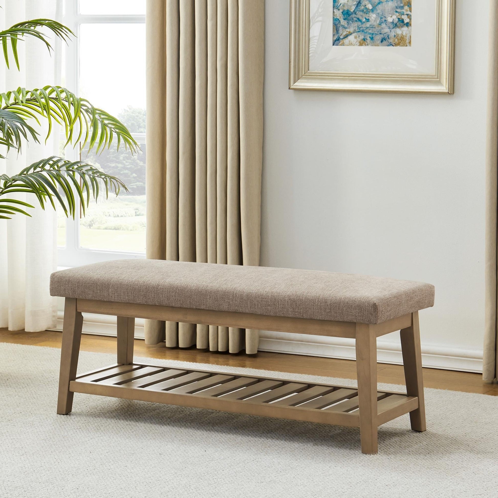 - Le tissu en lin doux rencontre le cadre en bois massif dans notre banc élégant