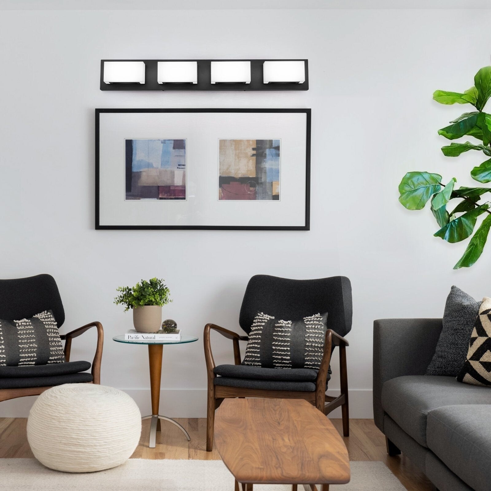 Add a sleek, contemporary flair to your bathroom or vanity area with this 3/4/5-Light rectangular LED vanity light. Designed with a unique hollow cube structure, this led vanity light features both inner and outer illumination, creating a clean, layered glow that enhances any modern interior. The matte black iron base pairs elegantly with frosted acrylic shades, offering a perfect balance of form and function. With energy-efficient LED lighting and a bright 6000K daylight color temperature, it's ideal for daily grooming or adding ambient brightness to your space.