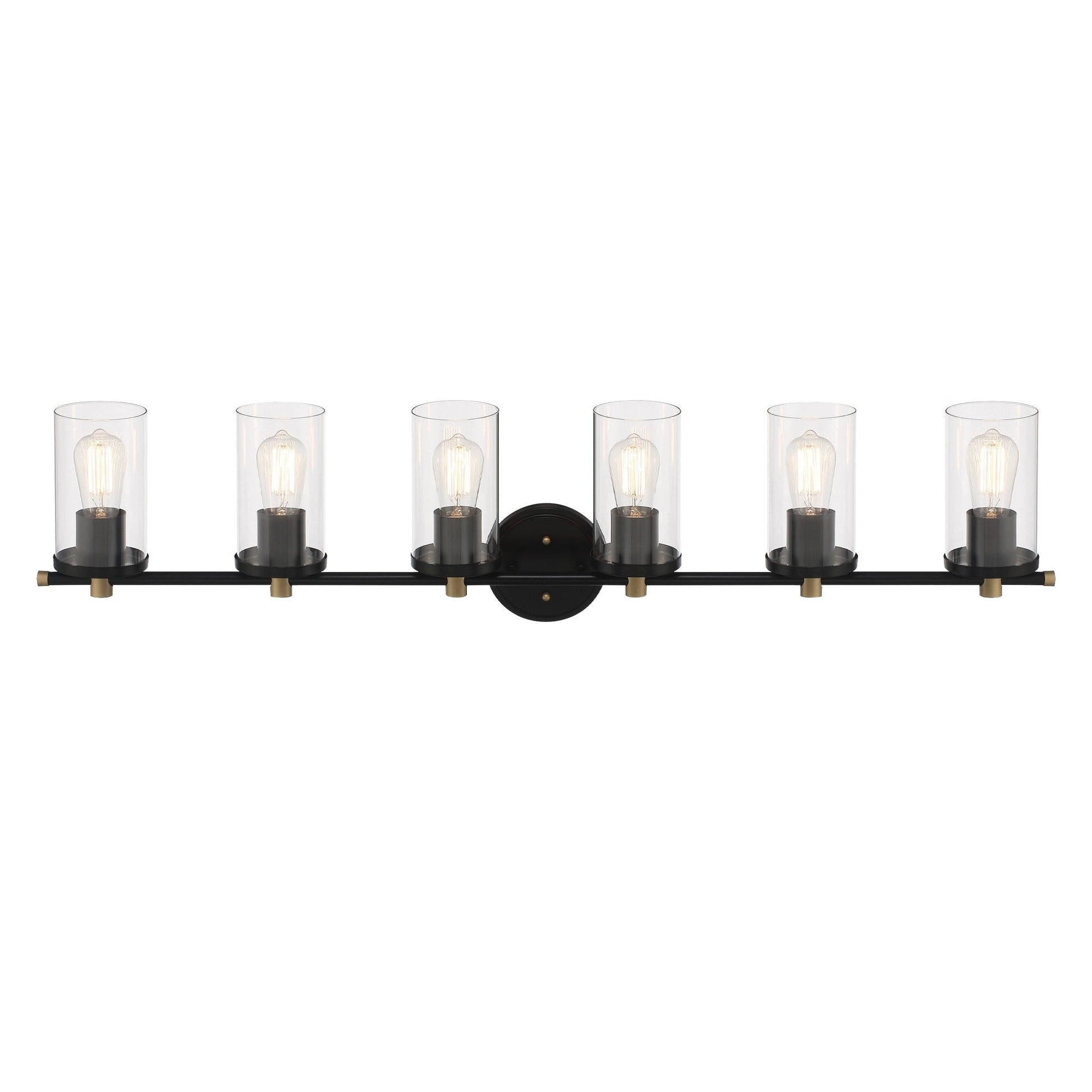 Ajoutez une touche rustique et moderne à votre salle de bain avec ce luminaire de salle de bain à 6 lumières. Fabriqué en acier de première qualité et en verre soufflé à la main, il est certifié UL pour une sécurité et une durabilité optimales. Avec sa finition noire et ses détails en laiton, ce luminaire de salle de bain s'intègre parfaitement aux styles moderne, transitionnel et rustique. Ses 6 lumières permettent d'éclairer une grande pièce comme la salle de bain, l'entrée ou la cuisine.