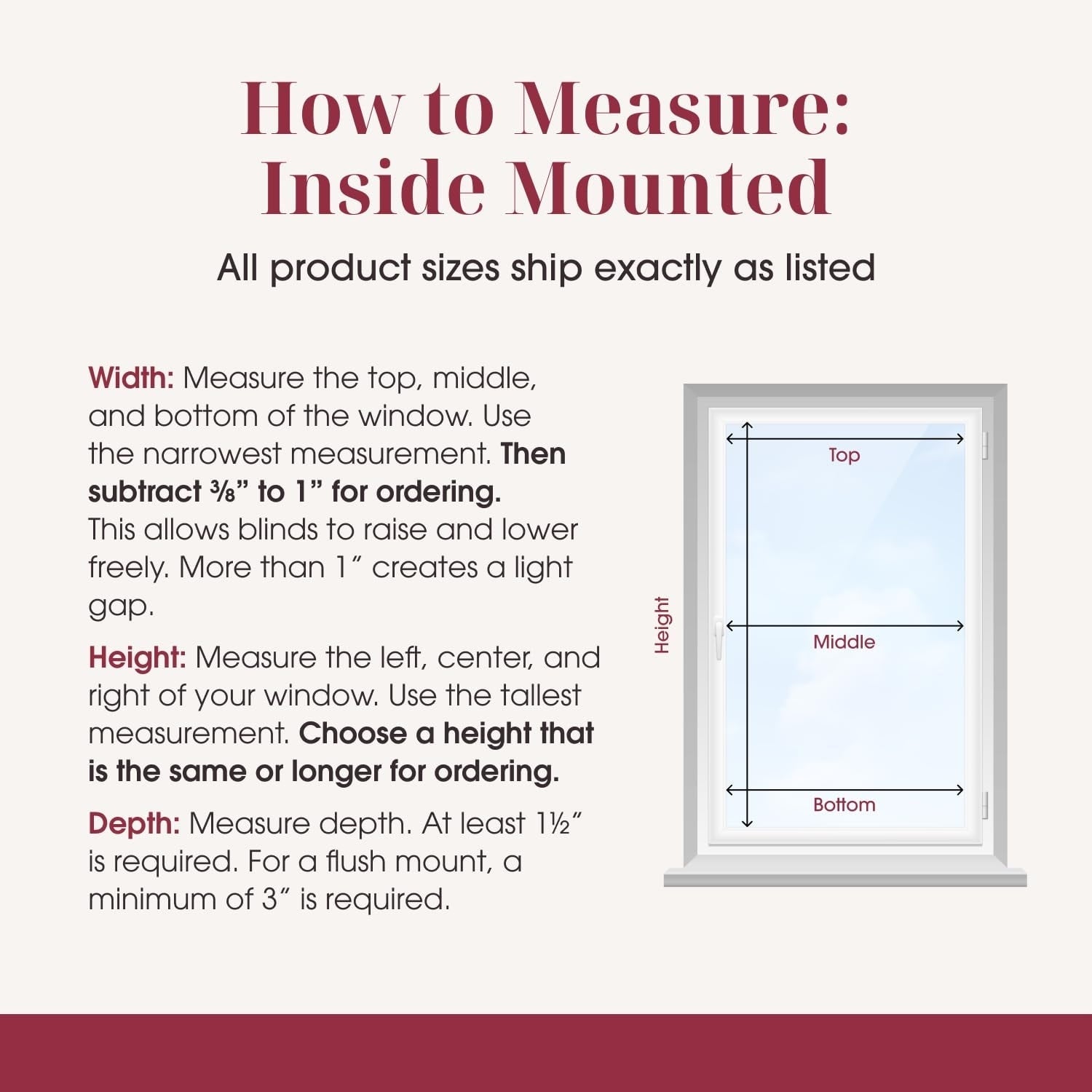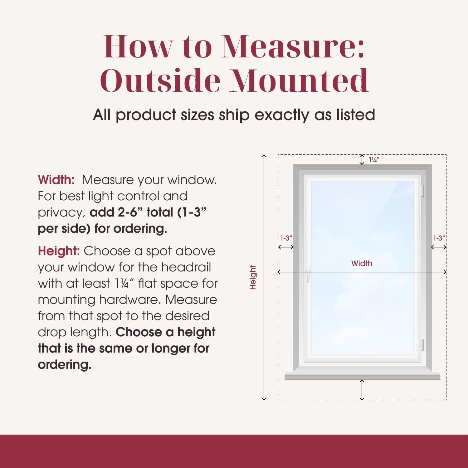 THE PERFECT FIT MADE EASY - Installation is easy with all necessary hardware and instructions included. For an inside mount, account for the hardware by ordering a size 3/8 inch smaller than the window width. Note that a 1-inch difference or more creates a large light gap. For an outside mount, we recommend adding 2-6 inches to your window's height and width for light control and privacy.