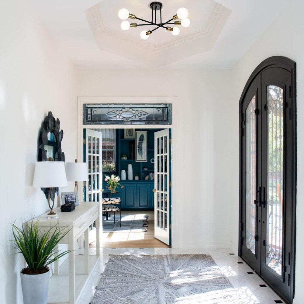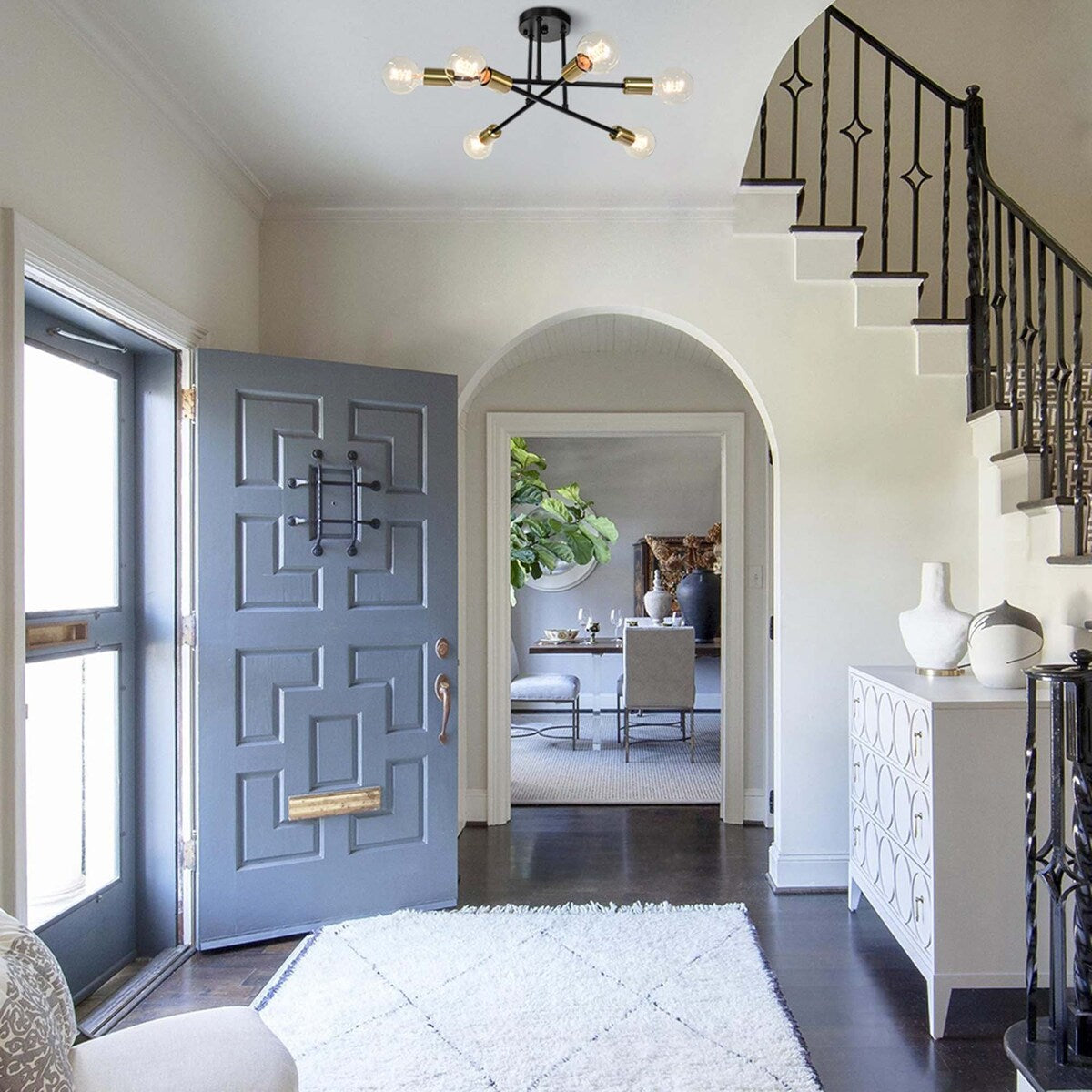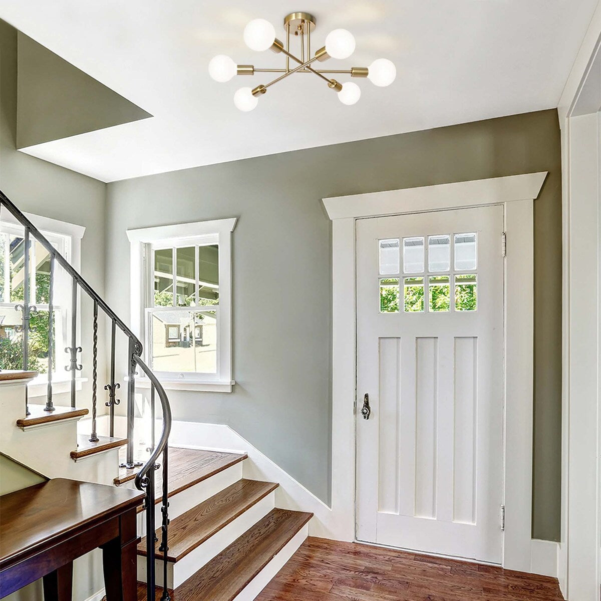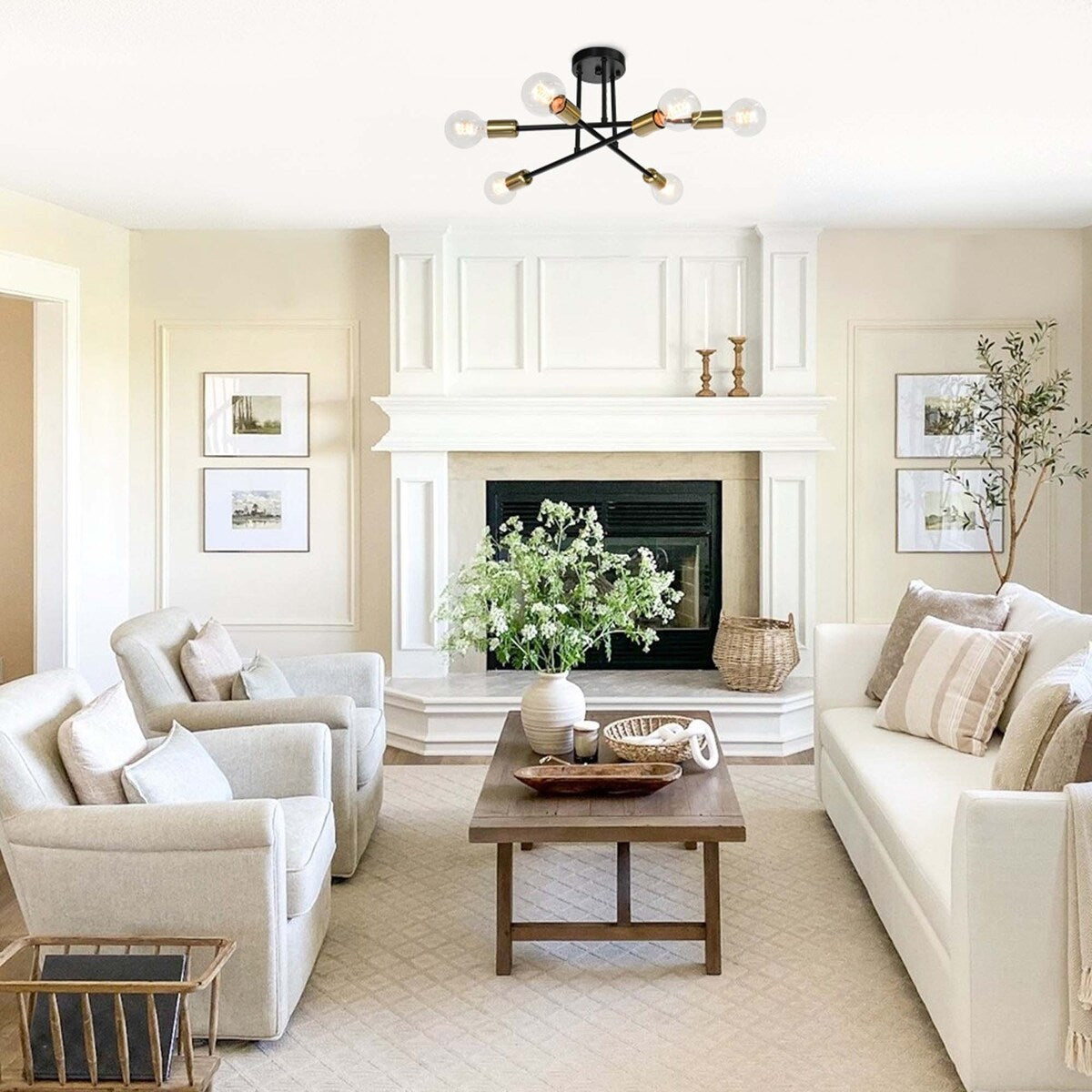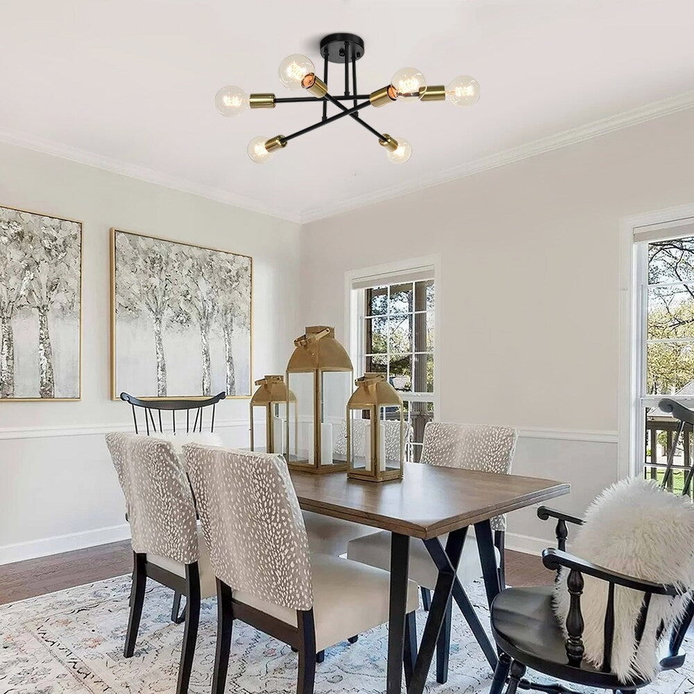 Bring a touch of mid-century modern style to your home with this striking six-light sputnik semi-flush mount ceiling light. Crafted from metal, it features a Space Race-inspired silhouette that adds a contemporary vibe to any room. Six compatible E26 medium-base bulbs (not included) sit exposed at the ends to cast ambient light, while the finish options of black, champagne gold, light brass, nickel, and white with gold provide versatility to match any decor.