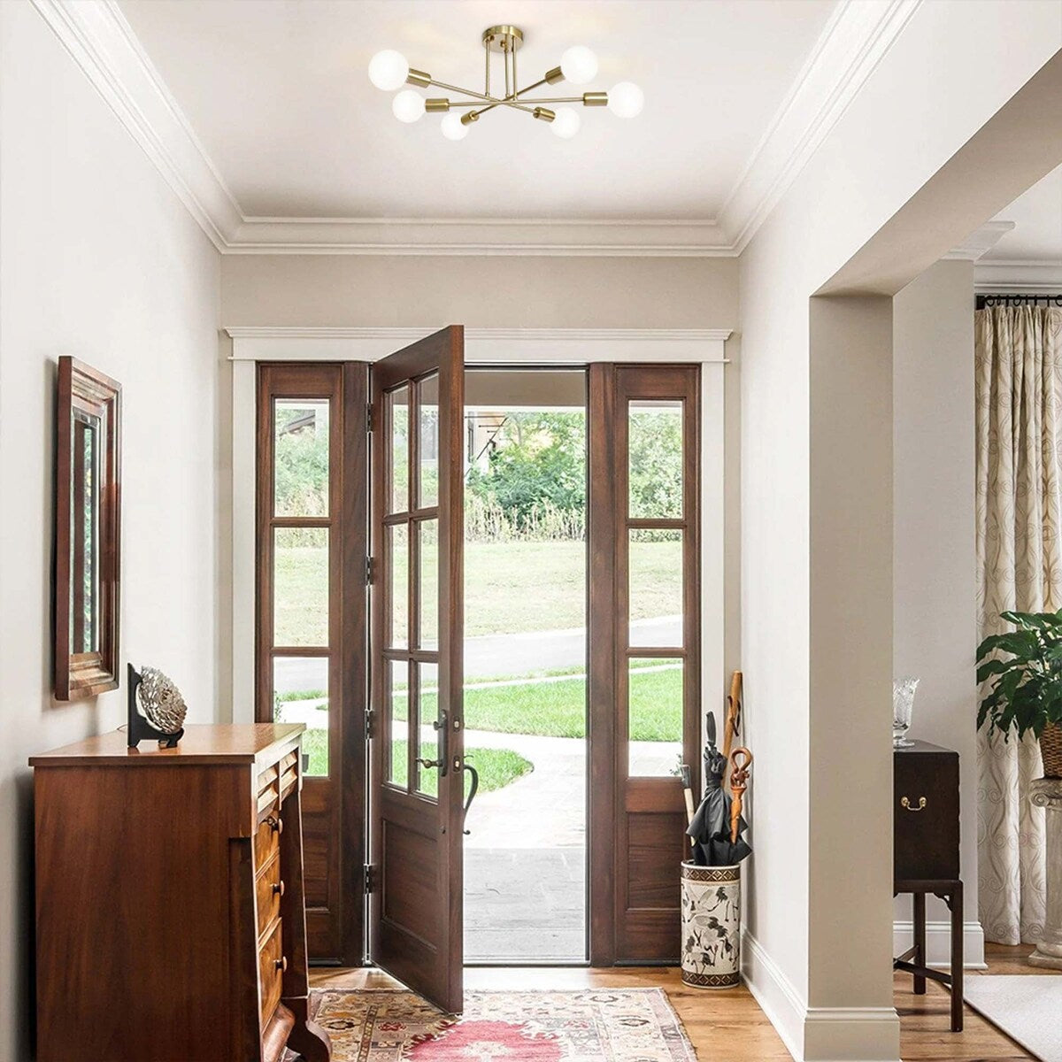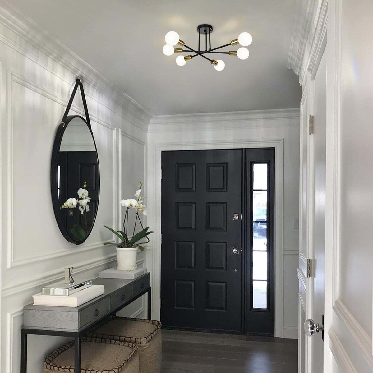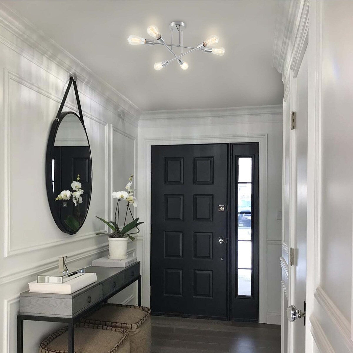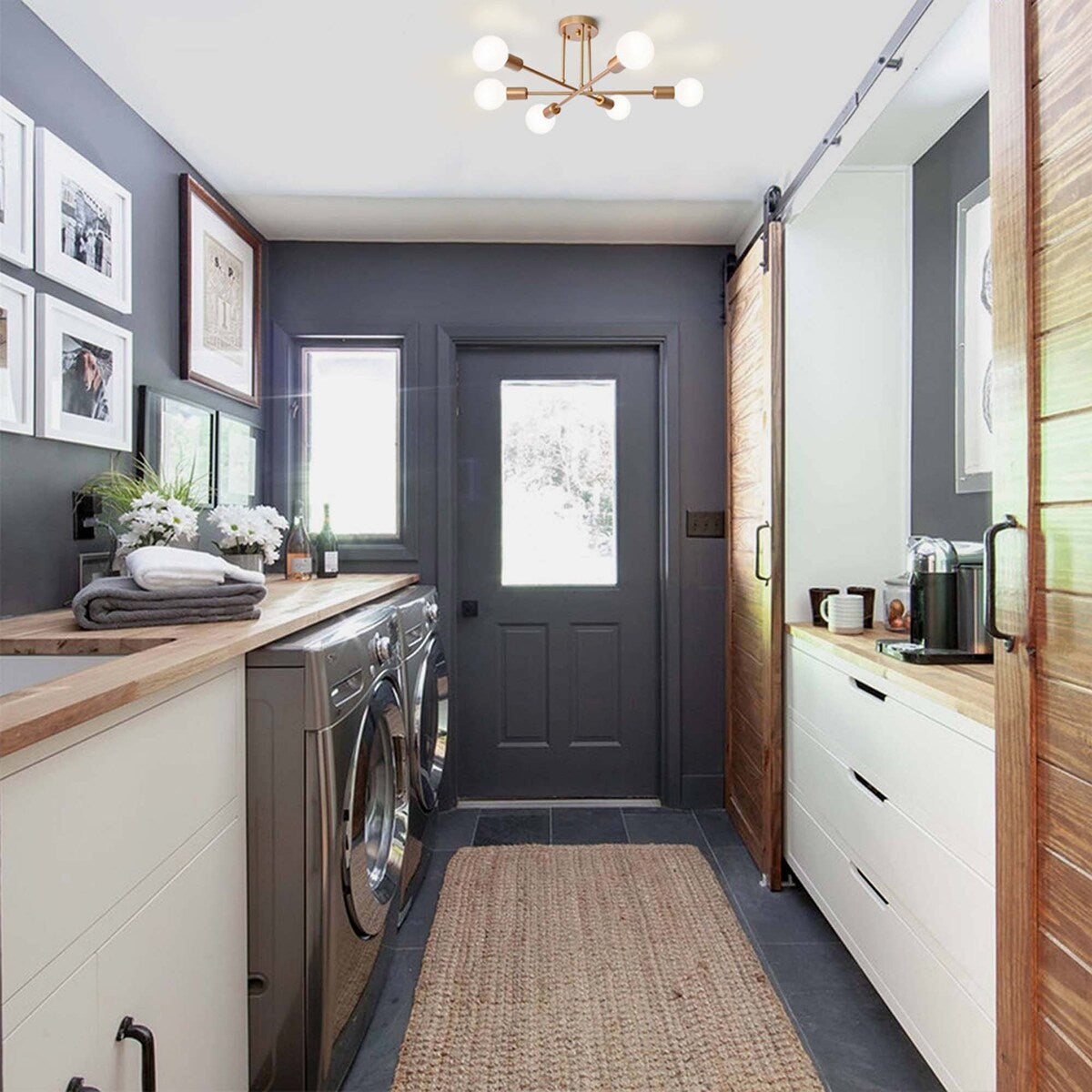 Bring a touch of mid-century modern style to your home with this striking six-light sputnik semi-flush mount ceiling light. Crafted from metal, it features a Space Race-inspired silhouette that adds a contemporary vibe to any room. Six compatible E26 medium-base bulbs (not included) sit exposed at the ends to cast ambient light, while the finish options of black, champagne gold, light brass, nickel, and white with gold provide versatility to match any decor.