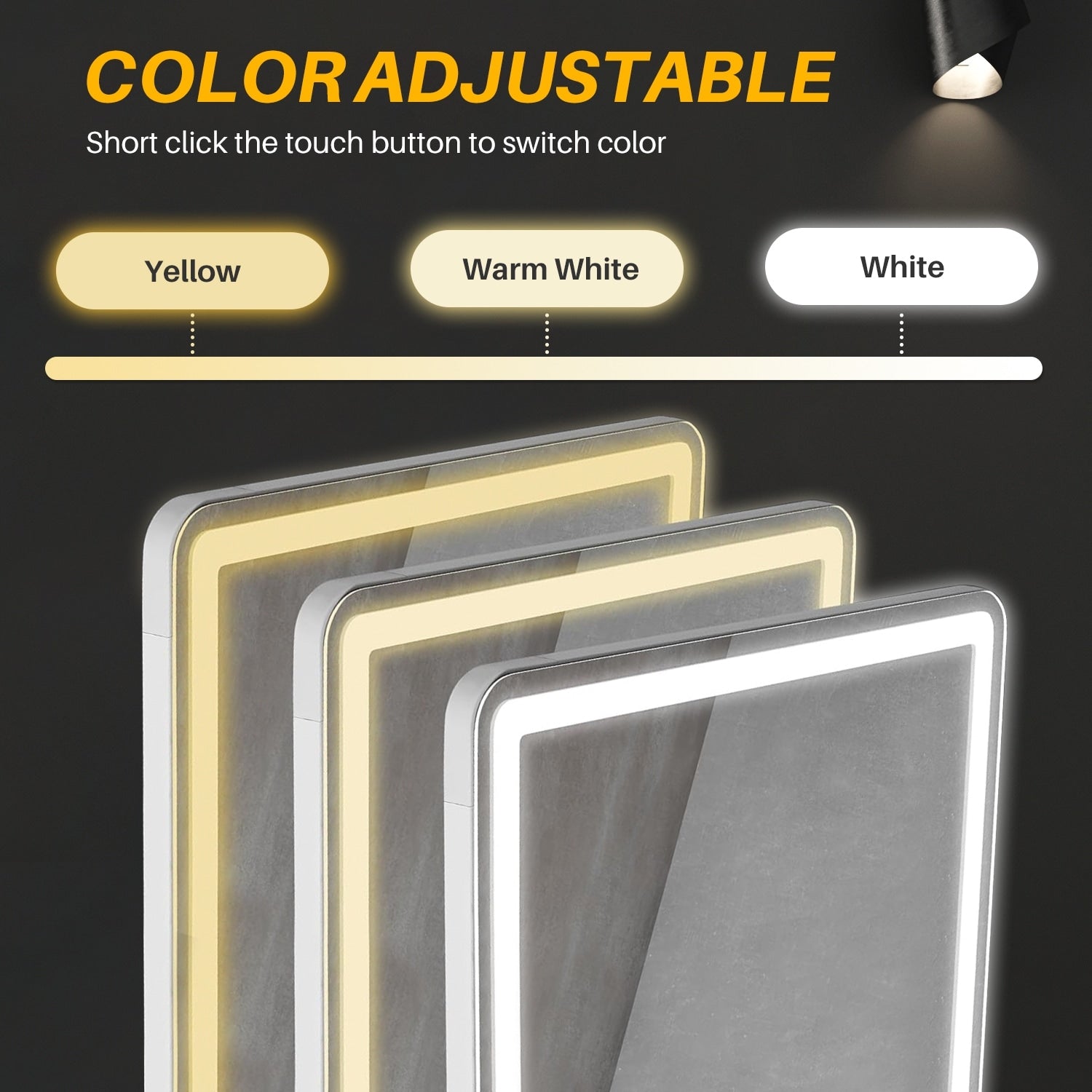 - Miroir lumineux : Ce miroir pleine longueur est équipé d'une bande de 200 LED réglables en luminosité et en couleur. Appuyez brièvement sur l'interrupteur tactile pour changer la température de couleur : lumière blanche, lumière chaude ou jaune. Appuyez longuement sur l'interrupteur pendant quelques secondes pour régler la luminosité.