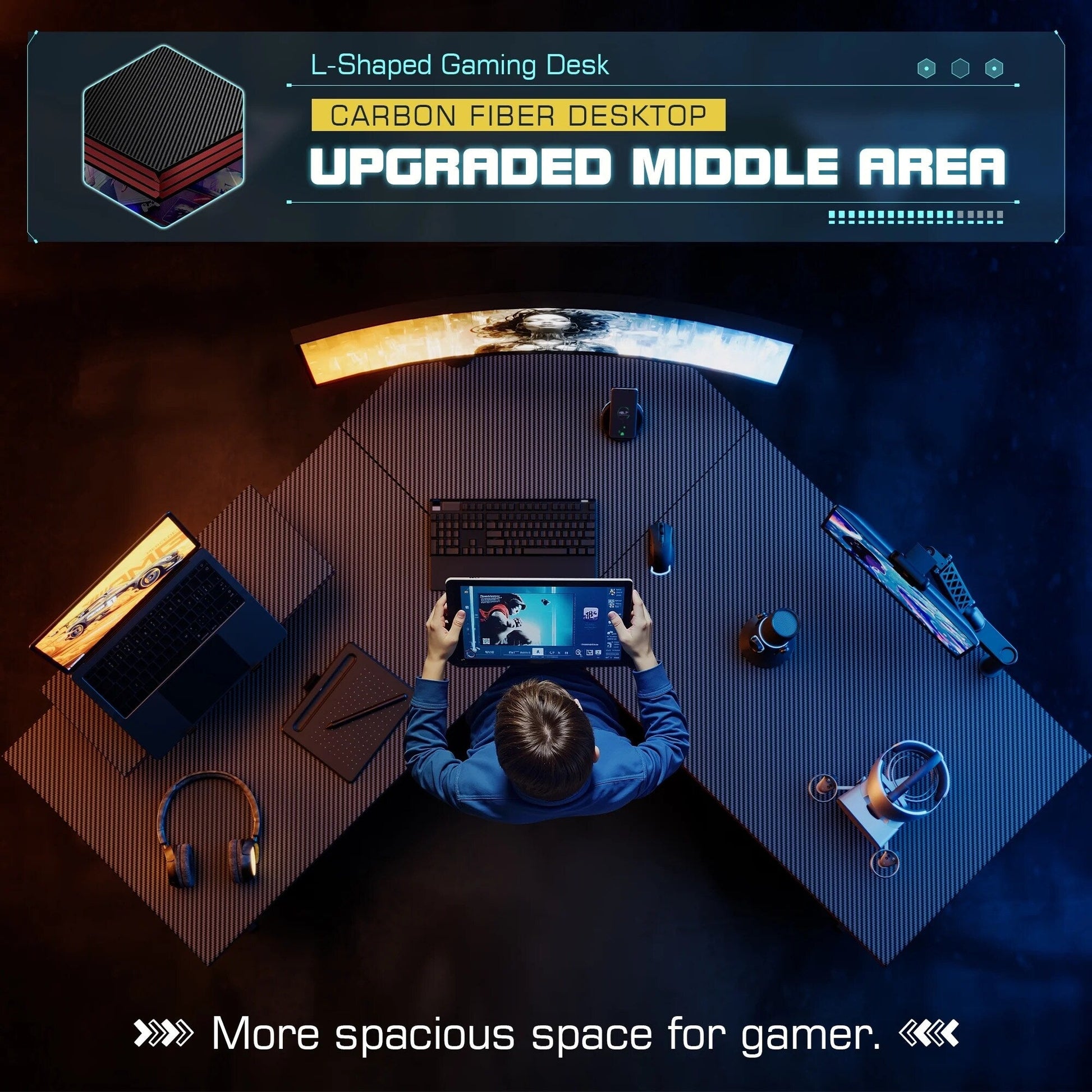 Homall L-shaped gaming desk and office desk has a spacious desktop that can meet various forms of use. Whether you use it to play computer games or use it for office work, we have carbon fiber and wooden table tops you can choose, it will definitely satisfy you here. L-shape can be well adapted to the corner environment to save enough space. The spacious desktop is enough to place all your electronic devices, and removable monitor stand could be installed on either the left or right side, convenient for you to use, let every gamer get the best gaming experience.