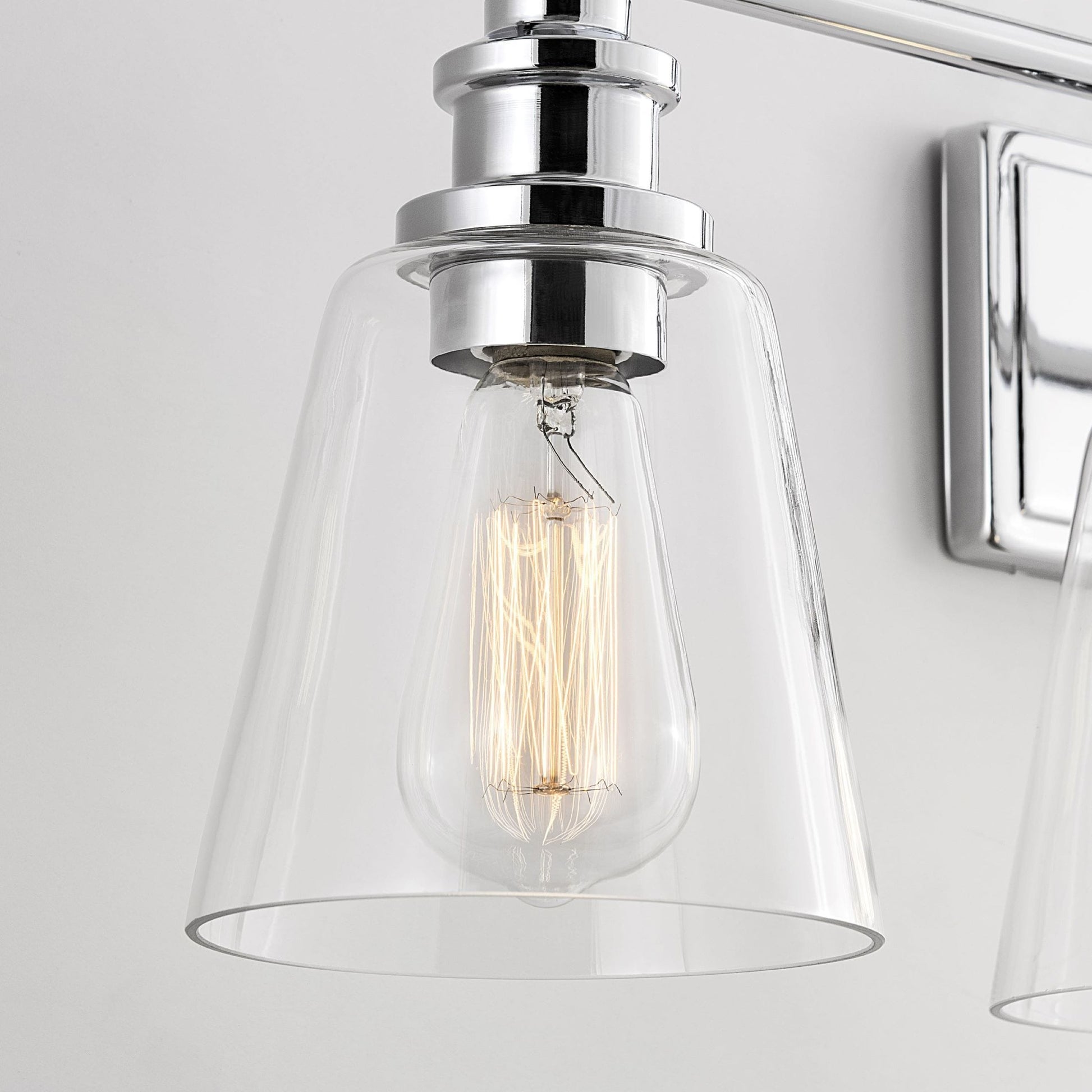From a farmhouse-style home to a modern industrial loft, this vanity light brings delight to many styles of spaces. Designed in two different finishes, this collection provides a customized look for your bathroom. With the elegance of clear glass shades, ample light flows freely. Available with 3 light and 4 light options to choose from that will fit both single and double vanity sink.