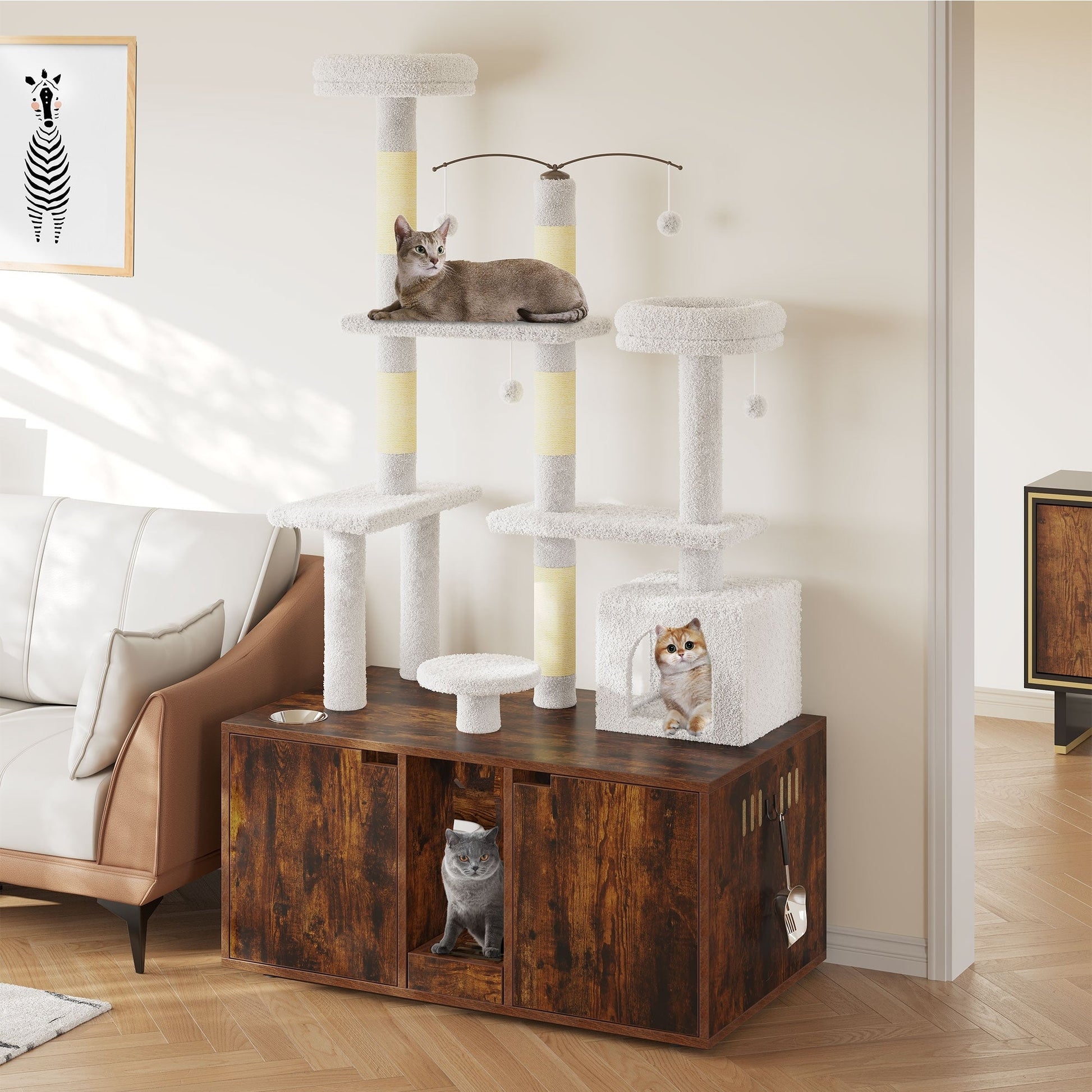Bienvenue dans ce spacieux enclos à litière double, conçu pour accueillir deux chats et améliorer leur cadre de vie. Ce design innovant allie une maison confortable et un arbre à chat attrayant, permettant un gain de place tout en offrant de nombreuses possibilités d'étirement, de griffage, de repos et de jeu. Fabriqué en bois de haute qualité, ce meuble est doté d'un tissu pelucheux facile à nettoyer et de griffoirs recouverts de corde de sisal, ainsi que de plateformes d'escalade et de niches douillettes pour la sieste et la cachette. L'étagère supérieure et le coussin amovibles sont faciles à retirer et à laver, pour un nettoyage simplifié. Créez un havre de paix épuré et convivial pour vos félins avec ce double enclos à litière !
