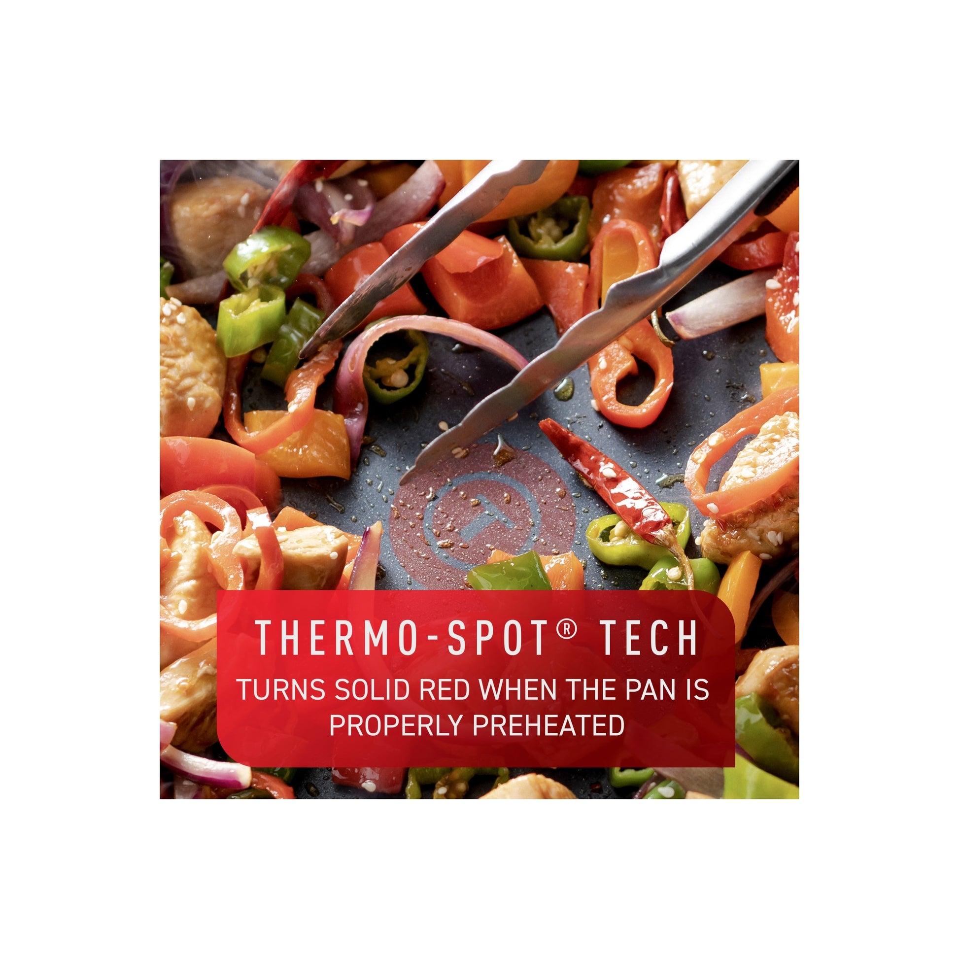 • Le Thermo-Spot devient rouge fixe pour indiquer que la poêle est correctement préchauffée (uniquement sur les poêles à frire et les sauteuses)