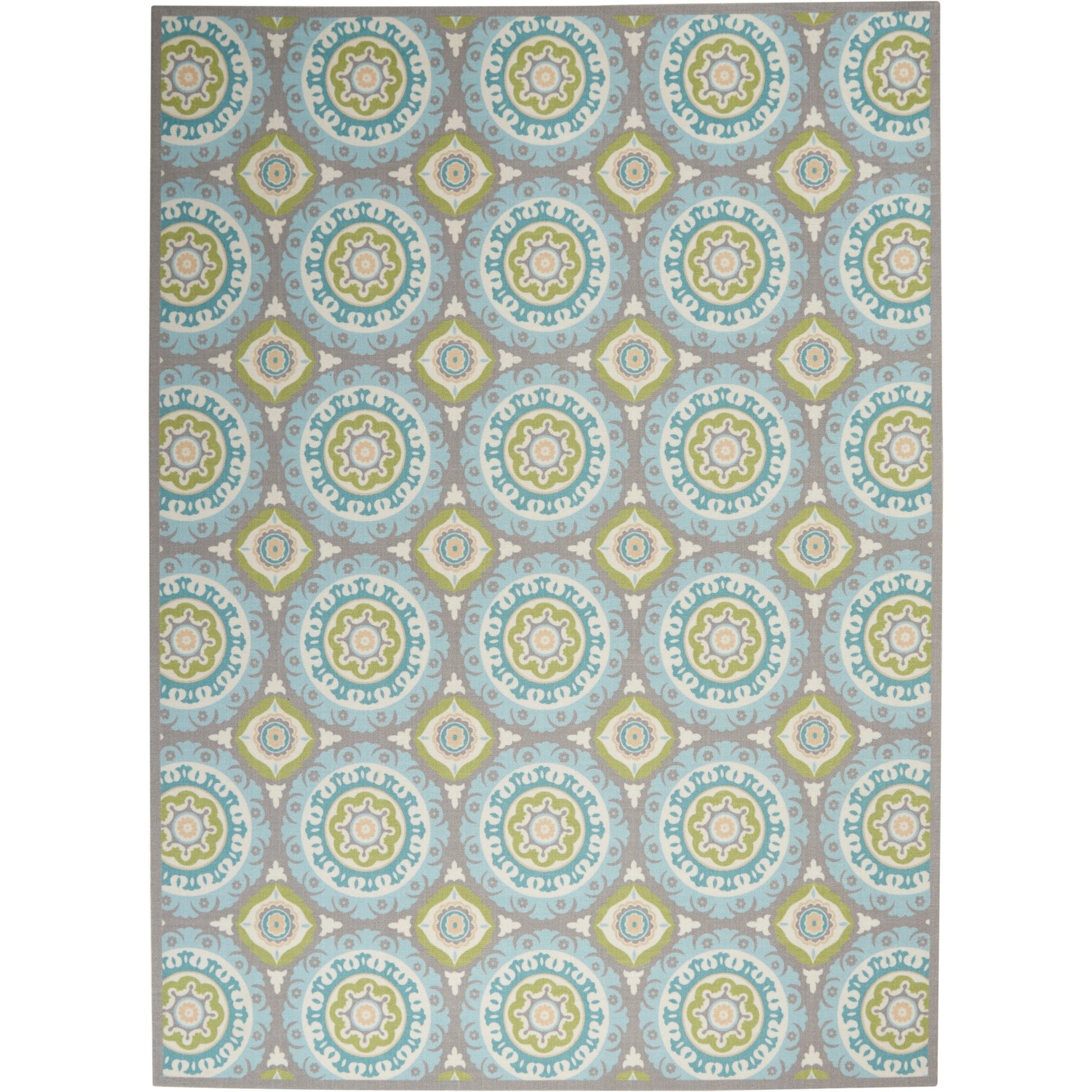 Bring a touch of cosmic appeal to your space with the Waverly Sun N' Shade Indoor Outdoor Boho Medallion Area Rug by Nourison. The rug features an interlocking medallion design in shades of aqua, blue, and pale green, creating a truly mesmerizing effect. Made with machine-made polyester and a .50 inch pile height, this rug has a contemporary, casual style and is suitable for indoor or outdoor use. It also contains latex and can be easily washed with an outdoor hose.